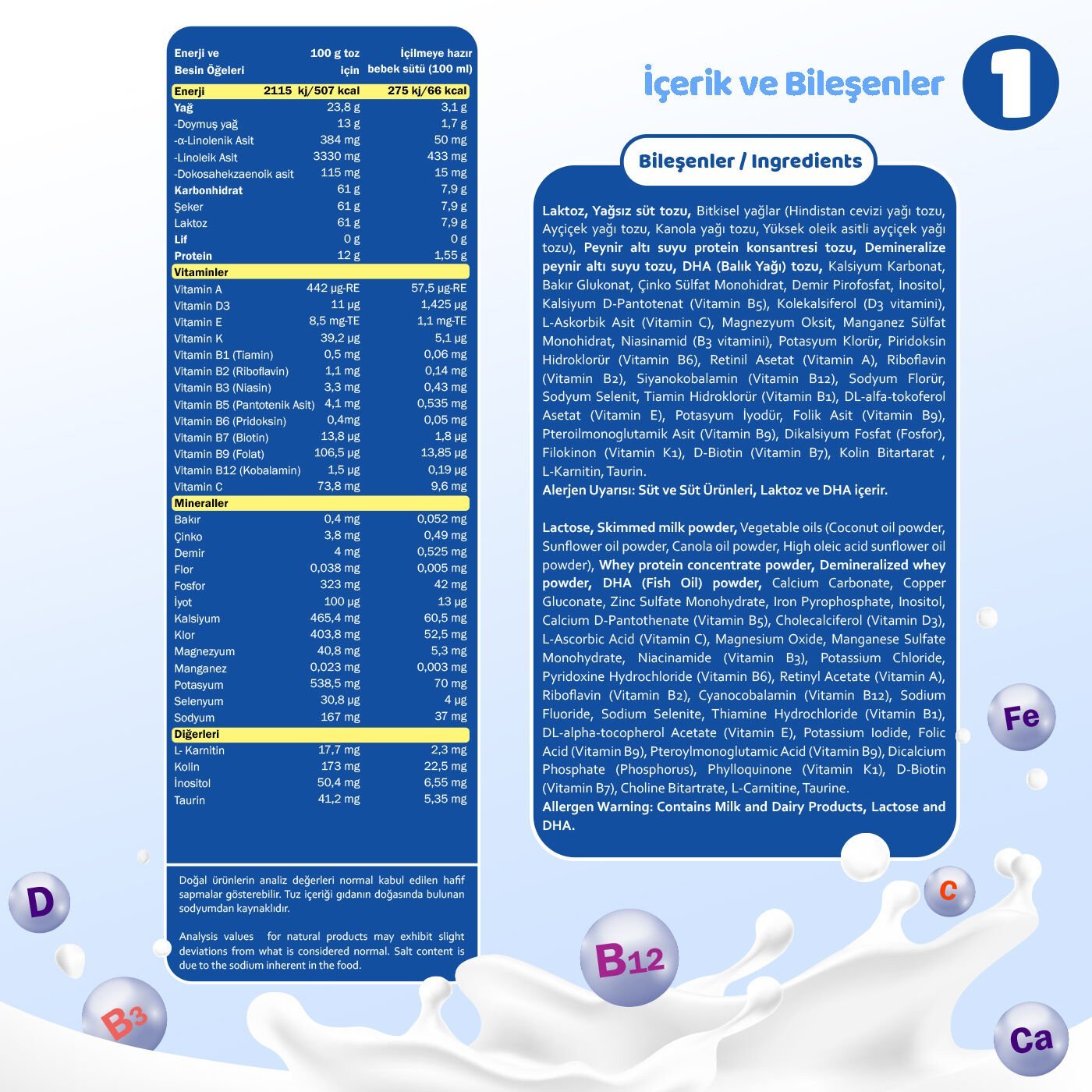 Yağsız Süt tozu, laktoz sütten, soya, peynir altı suyu ve omega 3’ e alerjisi olmayan 0 – 6 ay arası bebekler, Süt ve süt ütünleri, Süt şekeri laktoz ve DHA alerjeni içerir. |