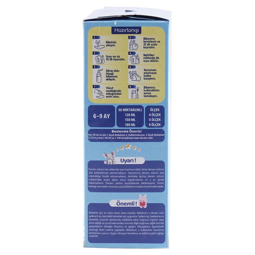 Bebekler için en üstün besin anne sütüdür. Bebehum 2 devam sütü sadece 6 aydan büyük bebekler için uygundur. Sadece tıp, beslenme ve diyetetik, eczacılık alanlarında niteliklere sahip bağımsız kişilerin veya anne sağlığı ve çocuk bakımından sorumlu diğer bağımsız sağlık hizmeti çalışanlarının bebeğin büyüme ve gelişim ihtiyaçlarına dayanılarak vereceği öneri üzerine yapılabilir. Bebehum 2 kullanırken hazırlama önerilerine uyunuz. Uygun olmayan hazırlama ve saklama şekli sağlığa zararlıdır.