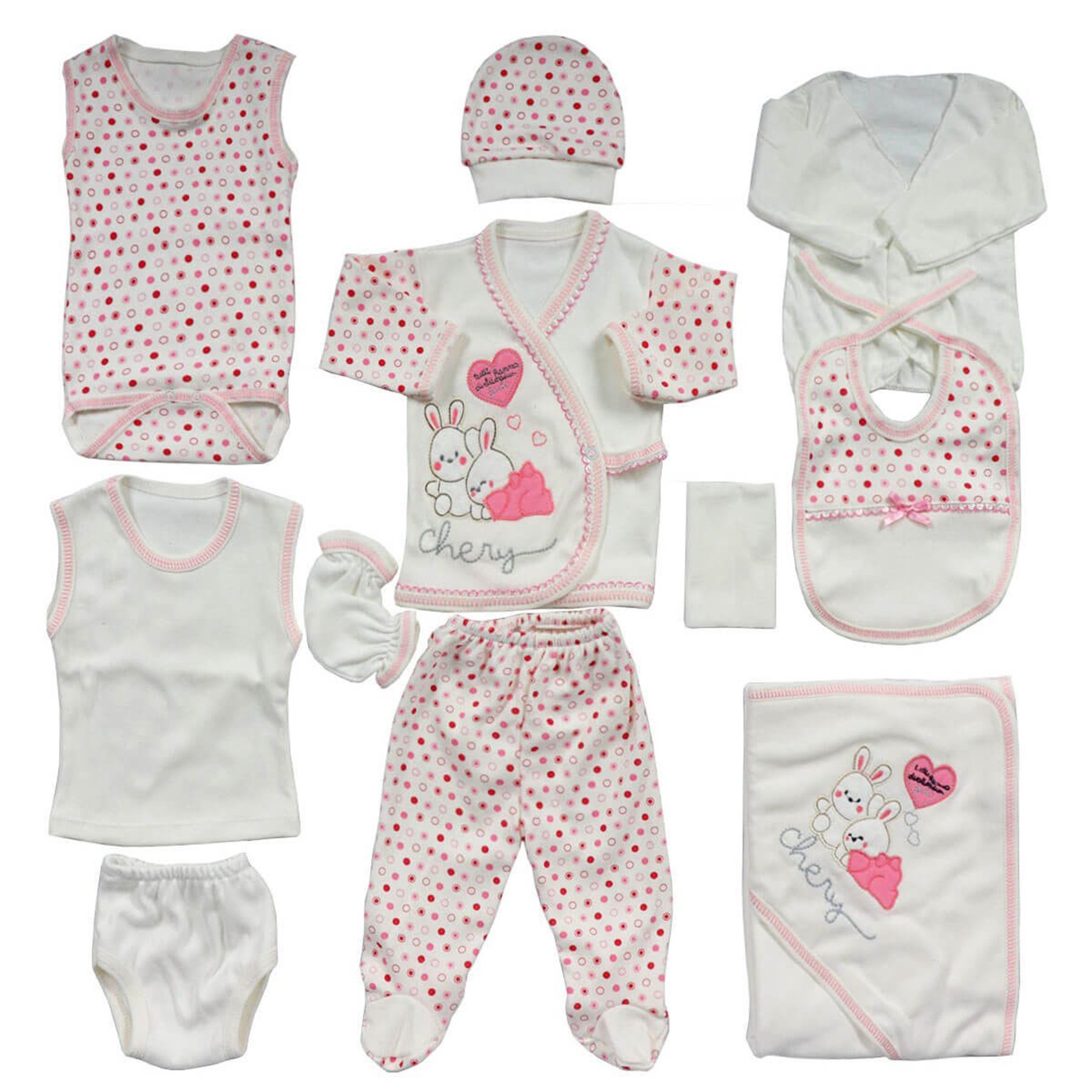 Chery Pembe Kalpli Tavşan Puanlı 11 Parça Yenidoğan Hastane Çıkış Seti 0-3 Ay