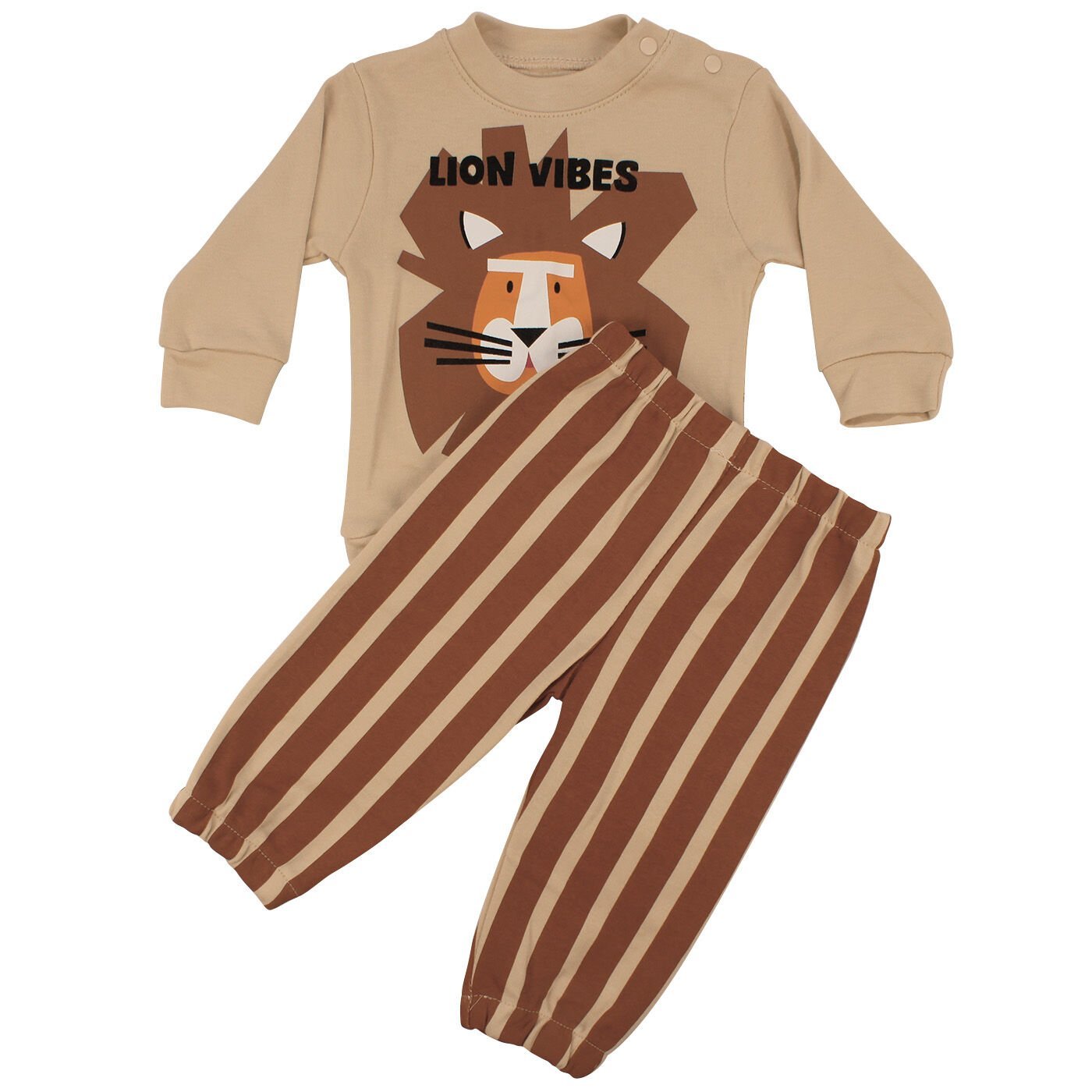 Erkek Bebek Bej Kahve Aslan Baskılı Çizgili İkili Takım