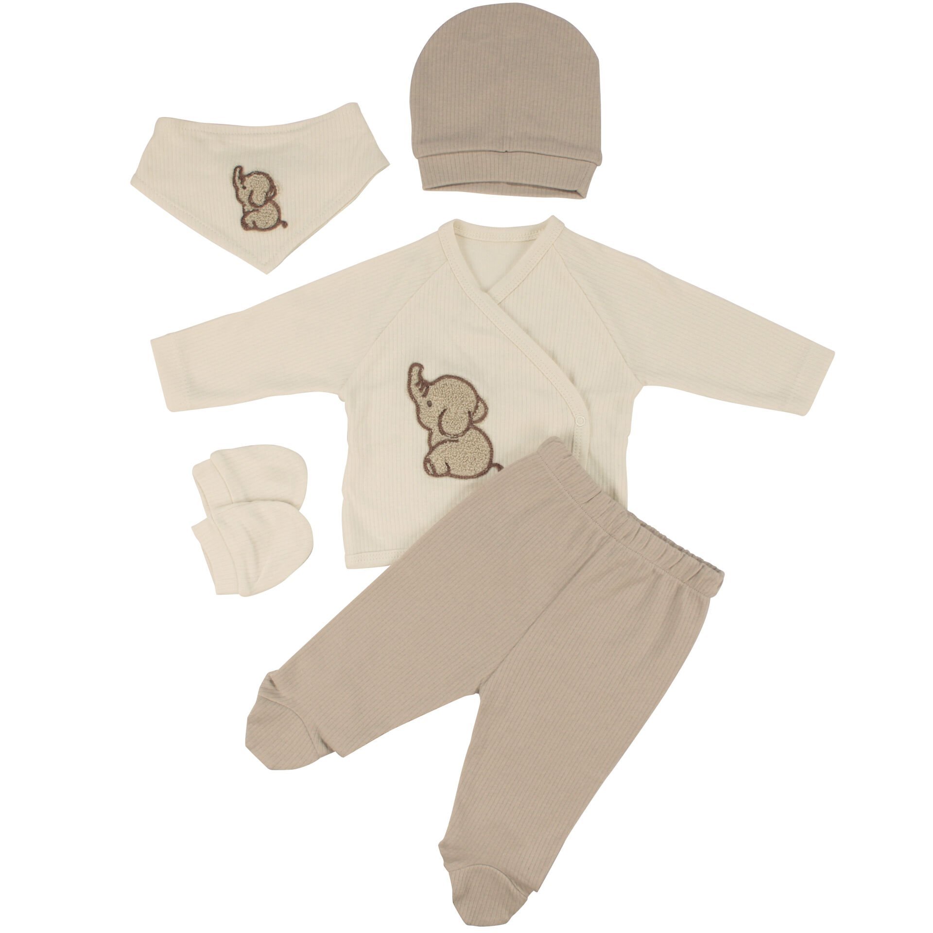 Erkek Bebek Bej Kahve Fil Nakışlı Beş Parça Hastane Çıkış Seti