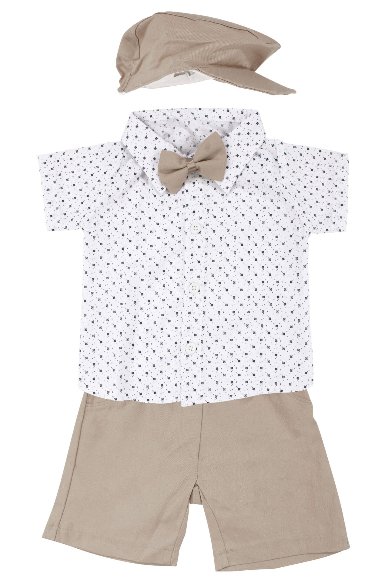 Erkek Bebek Beyaz Kahve Desenli Gömlekli Şapkalı Papyonlu Şortlu Takım