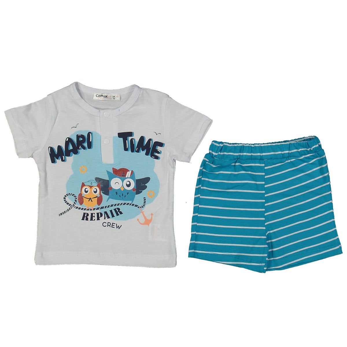 Erkek Bebek Beyaz Mavi Baykuş Baskılı Çizgili Şortlu Takım