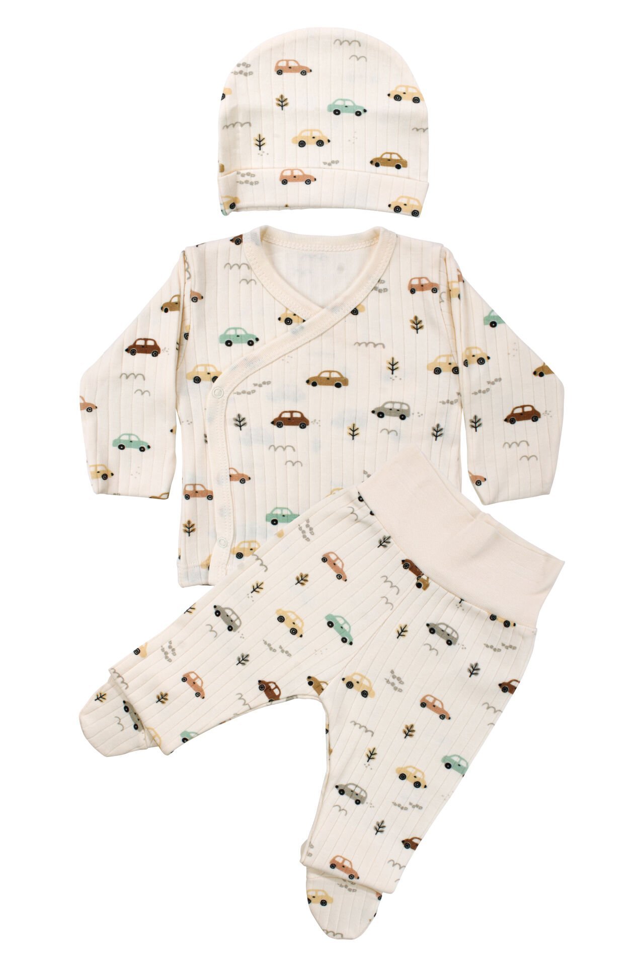 Erkek Bebek Ekru Araba Desenli Üçlü Takım 0-3 Ay