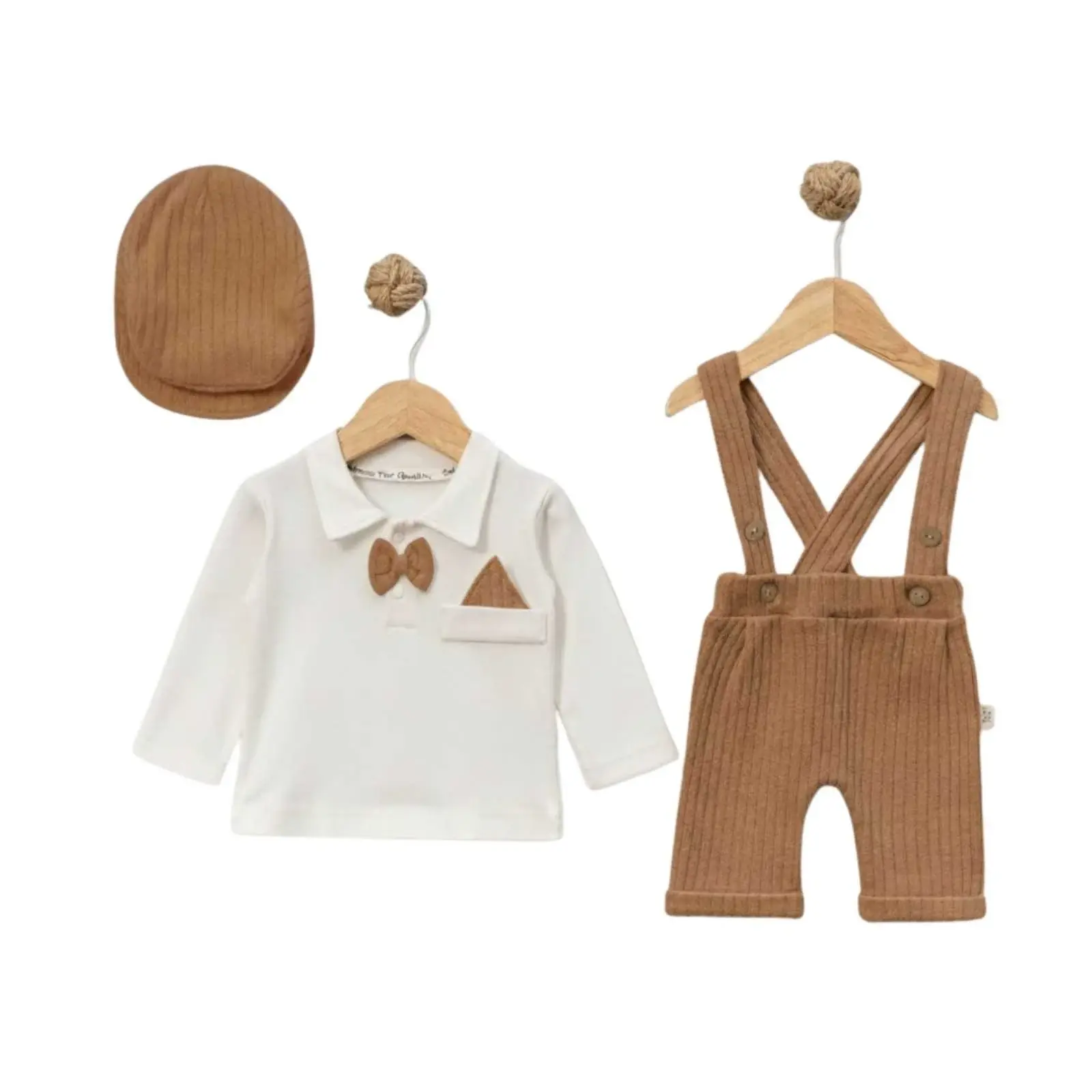 Erkek Bebek Ekru Kahve Papyonlu Şapkalı Fitilli Salopet Takım