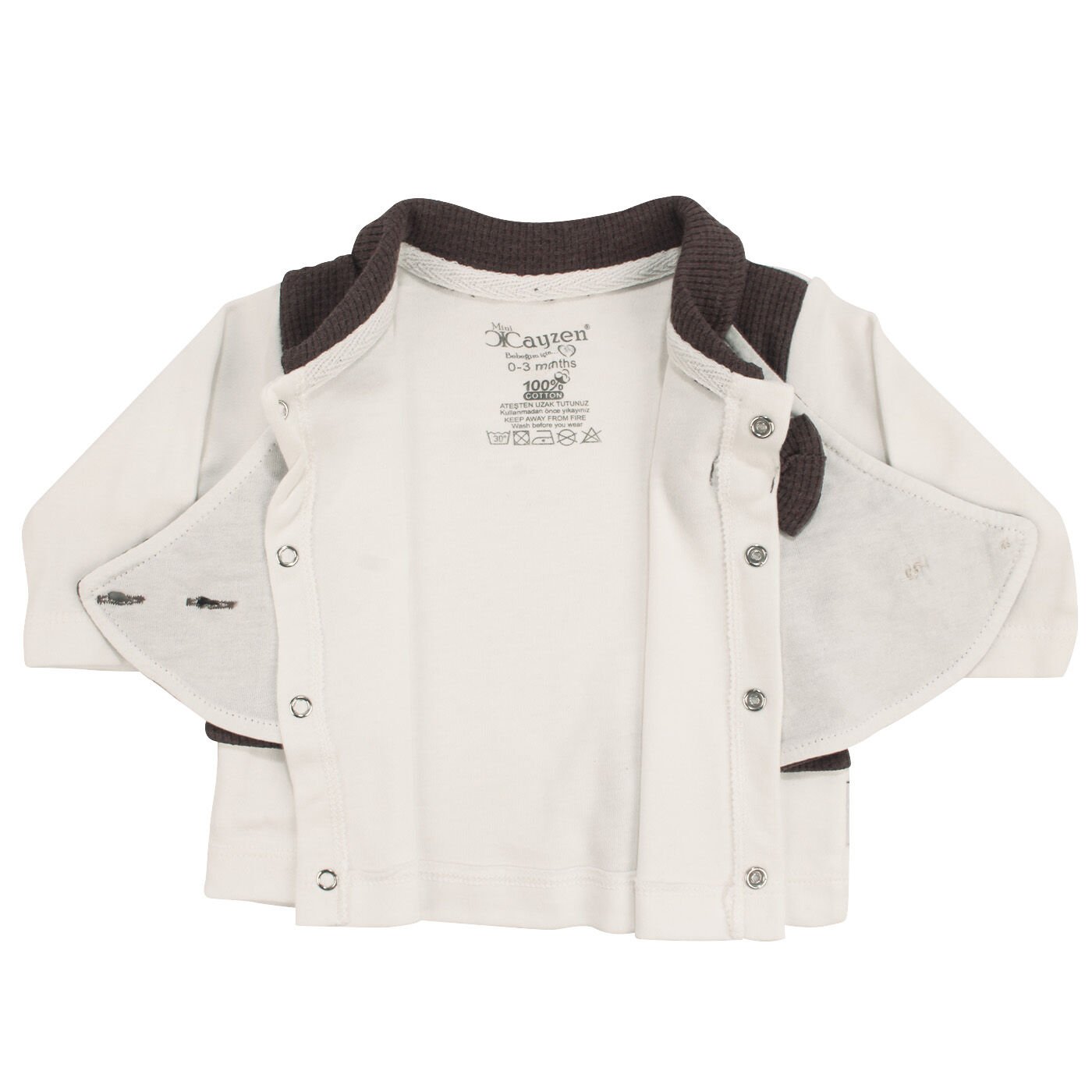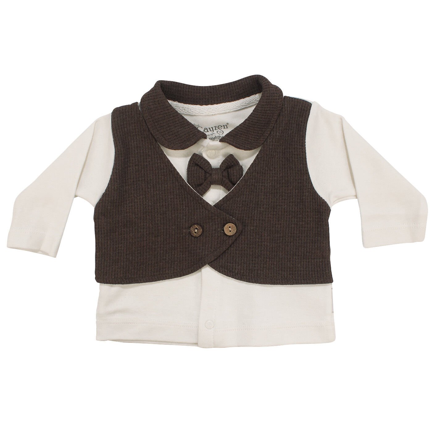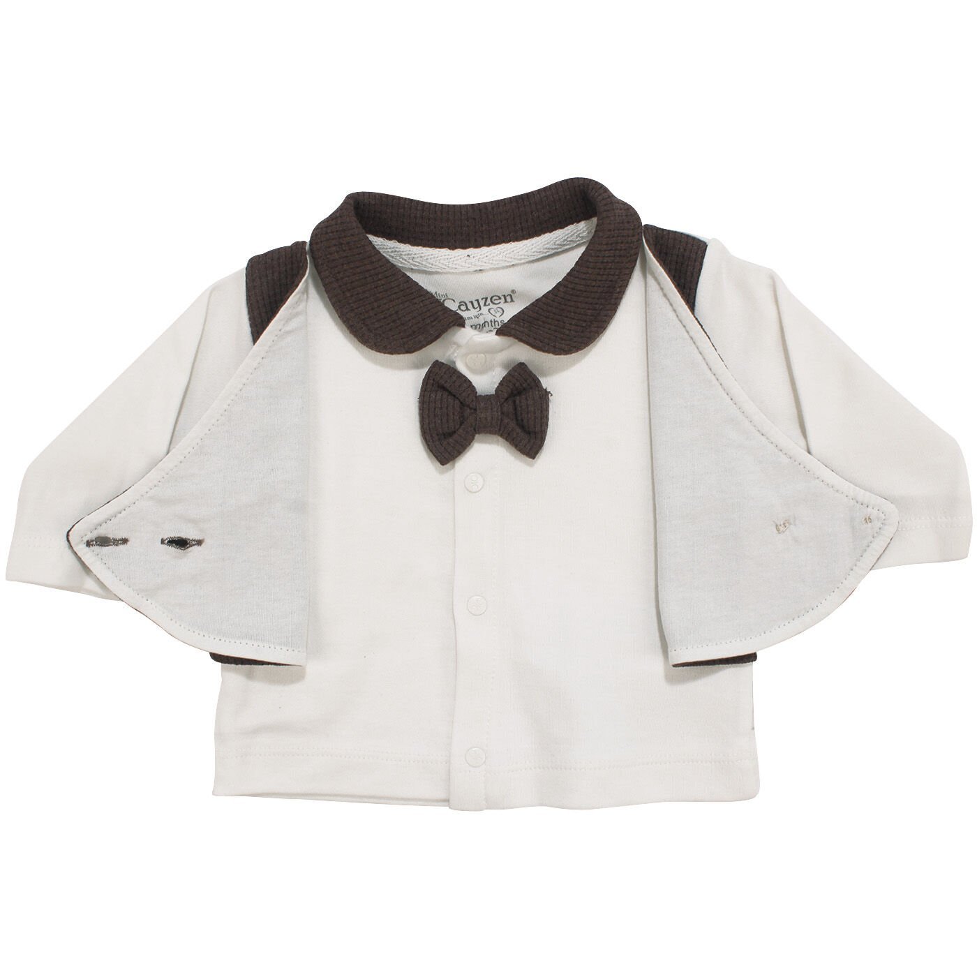 Set, ekru ve kahve renk uyumu ile modern ve zarif bir görünüm sunar. Üstteki papyon ve şapka detayları, minik bebeğinize tatlı ve dikkat çekici bir şıklık katar. Kendinden yelekli tasarımı ile pratik bir kullanım sağlar ve bebeklerinizin hem rahat hem şık olmasını garanti eder.