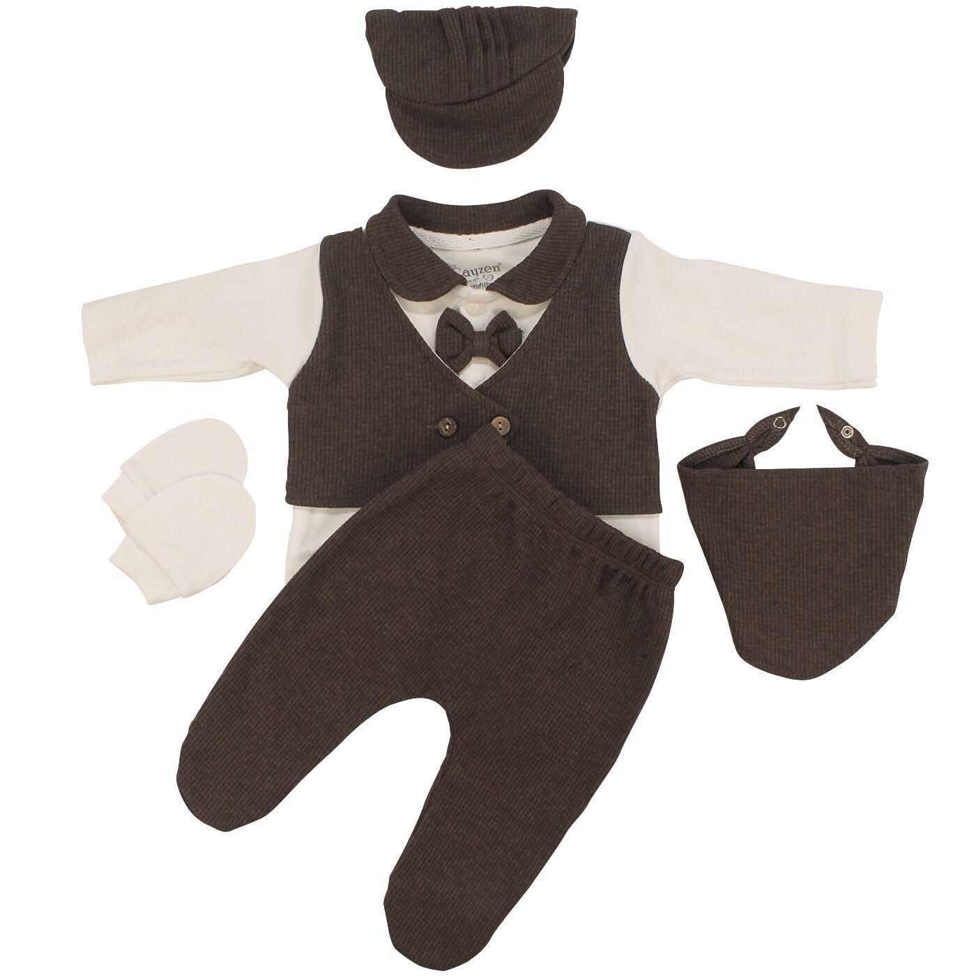 Erkek Bebek Ekru Kahve Papyonlu Şapkalı Kendinden Yelekli Beş Parça Hastane Çıkış Seti