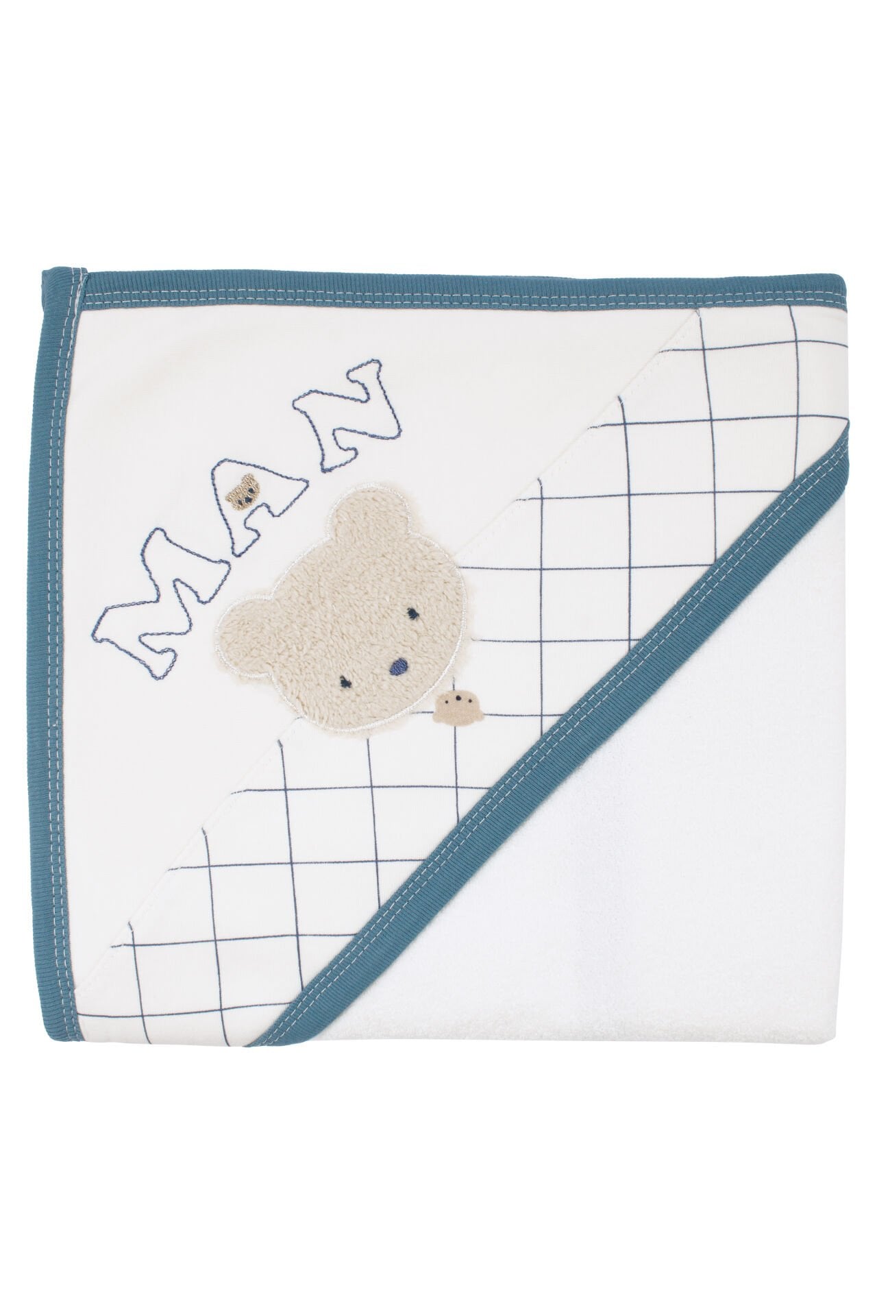 Sevimli ve özenli tasarımıyla öne çıkan bu havlu, ekru ve mavi renk uyumunu “Man” yazı nakışı ve ayı nakış detayları ile bir araya getirir. Nakış işlemeleri ürüne estetik ve dikkat çekici bir görünüm kazandırır.