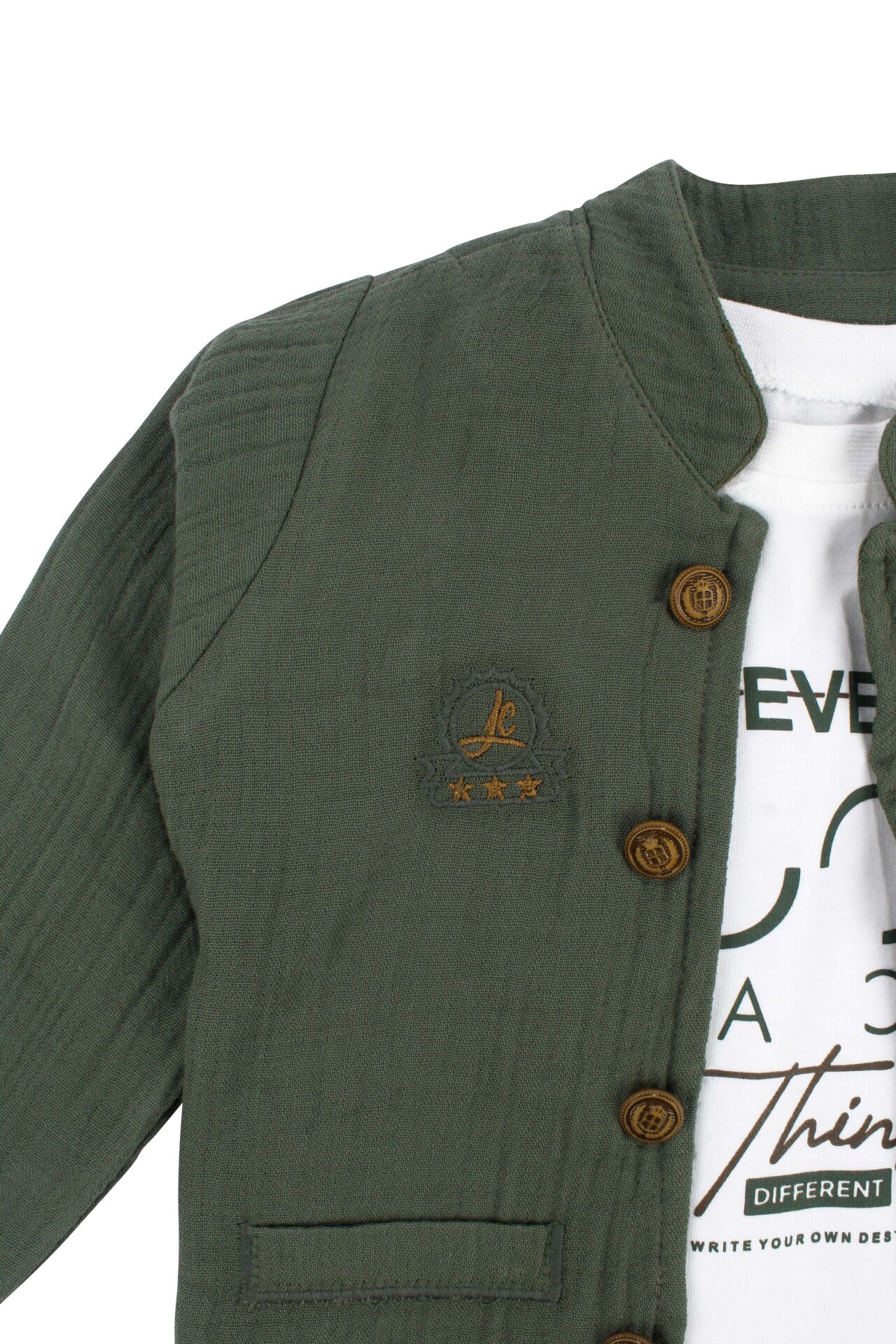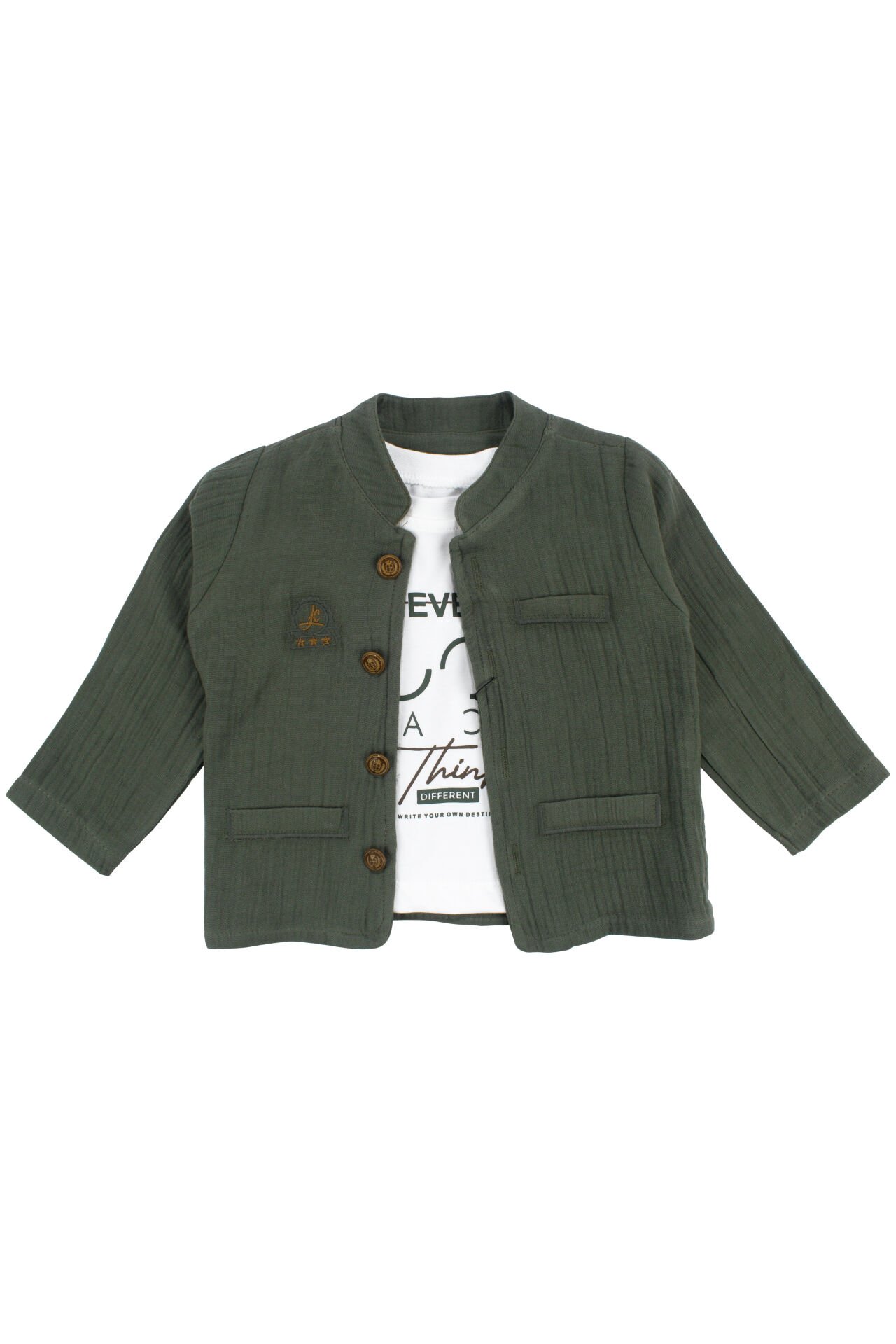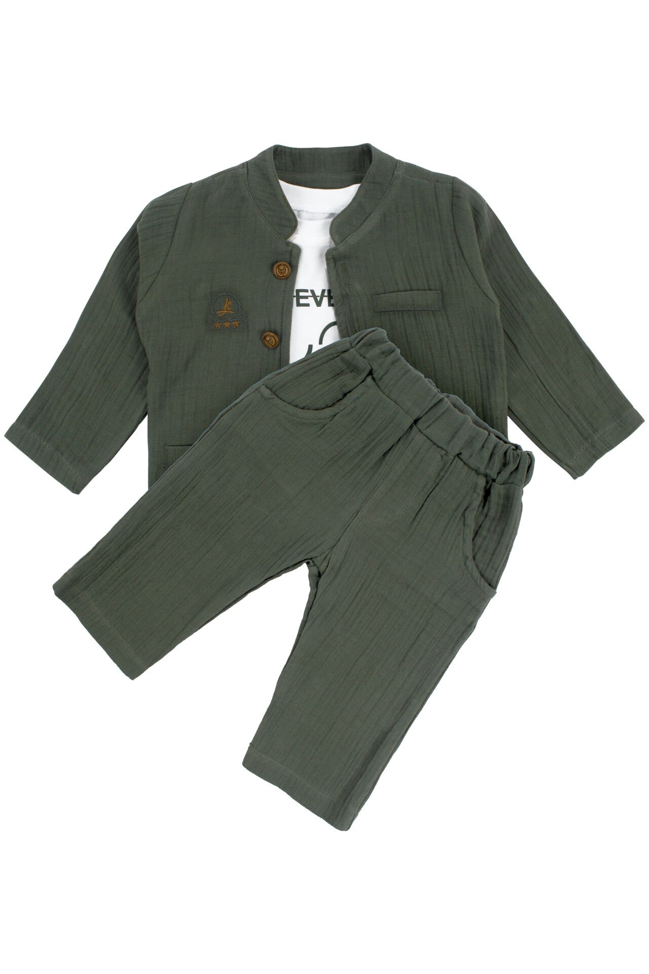 Erkek Bebek Ekru Never Look Back Yazılı Yeşil Müslin Ceketli 3'lü Takım