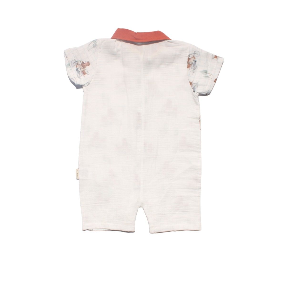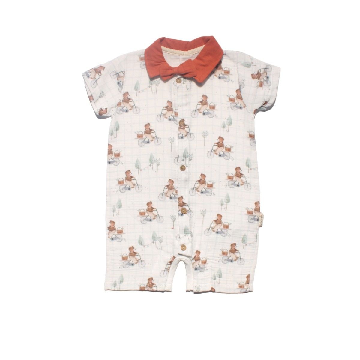 Erkek Bebek Ekru Turuncu Yakalı Papyonlu Ayıcık Baskılı Düğmeli Müslin Tulum