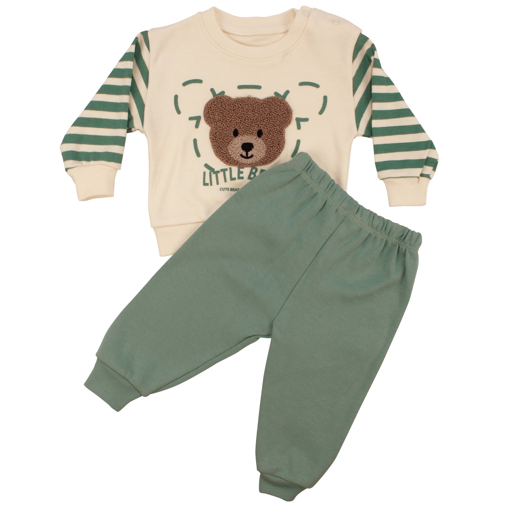 Erkek Bebek Ekru Yeşil Çizgili Ayı Nakışlı 2'li Takım