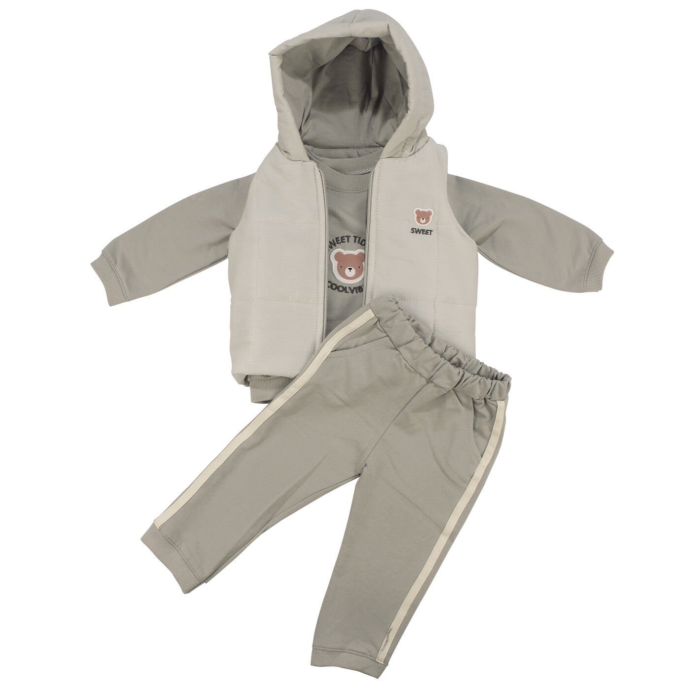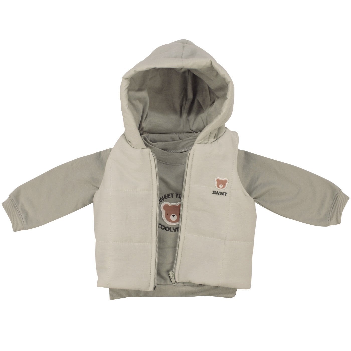Erkek Bebek Gri Şişme Yelekli Ayı Nakışlı Üçlü Takım