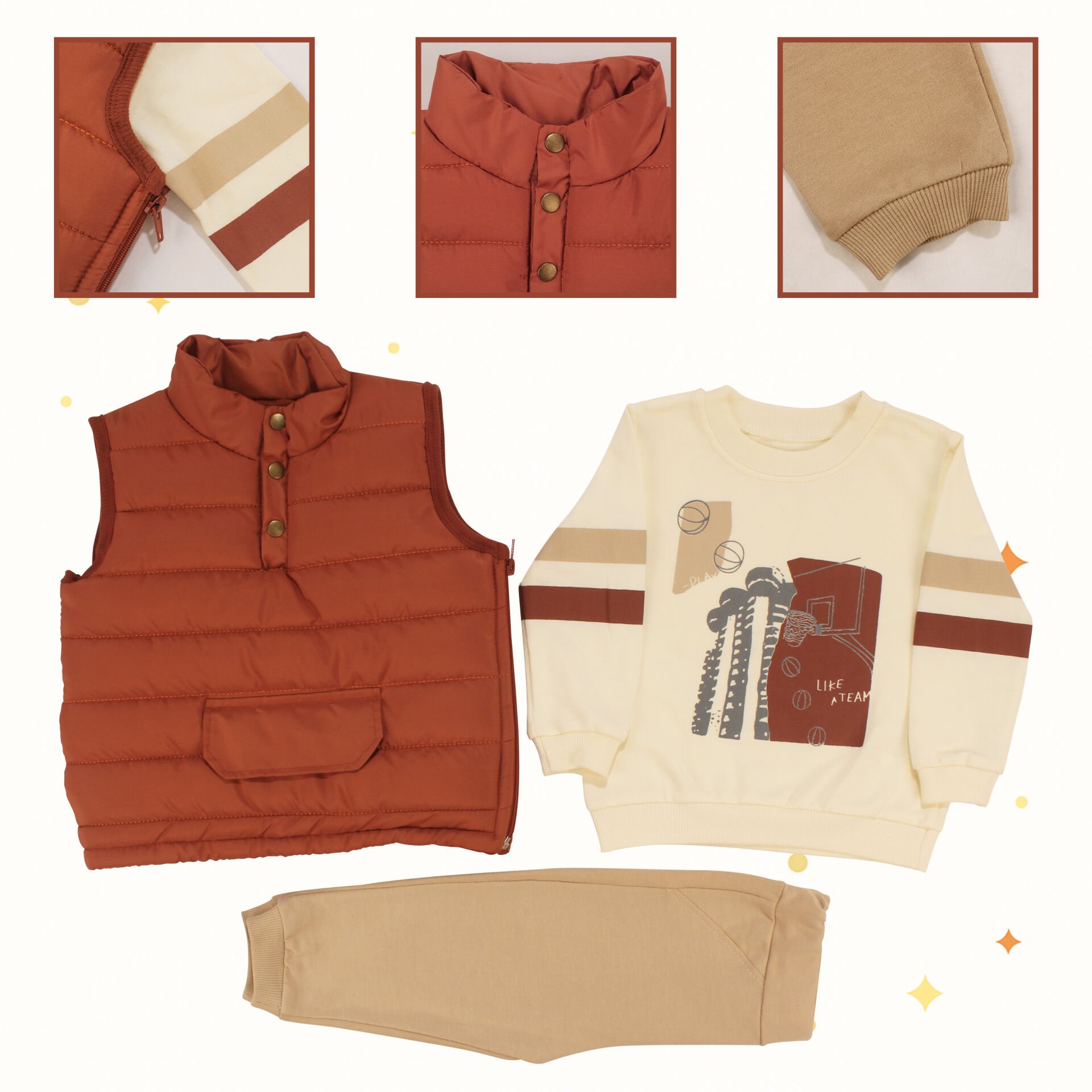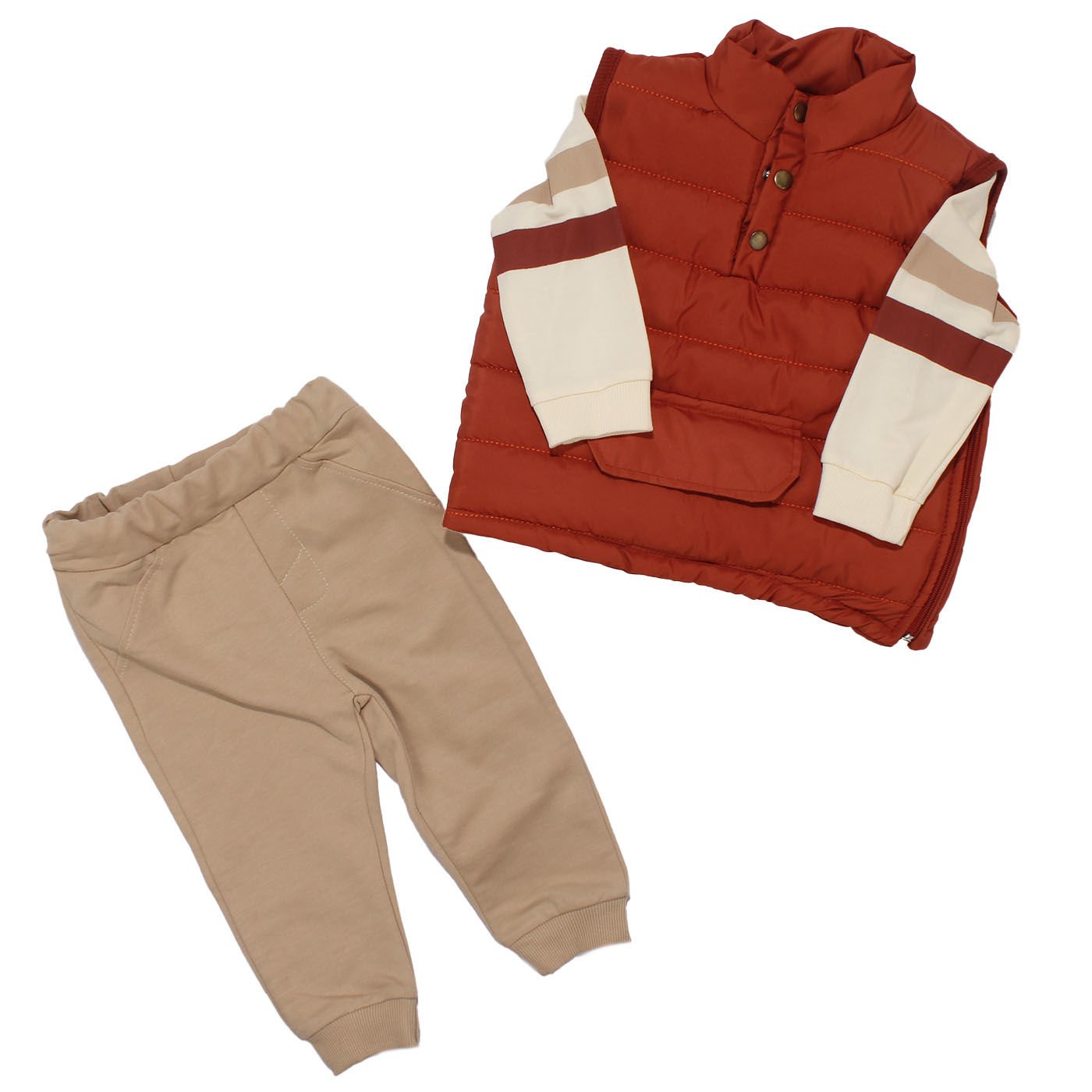 Erkek Bebek Kiremit Bej Şişme Yelekli Önü Kapalı Cepli 3'lü Takım