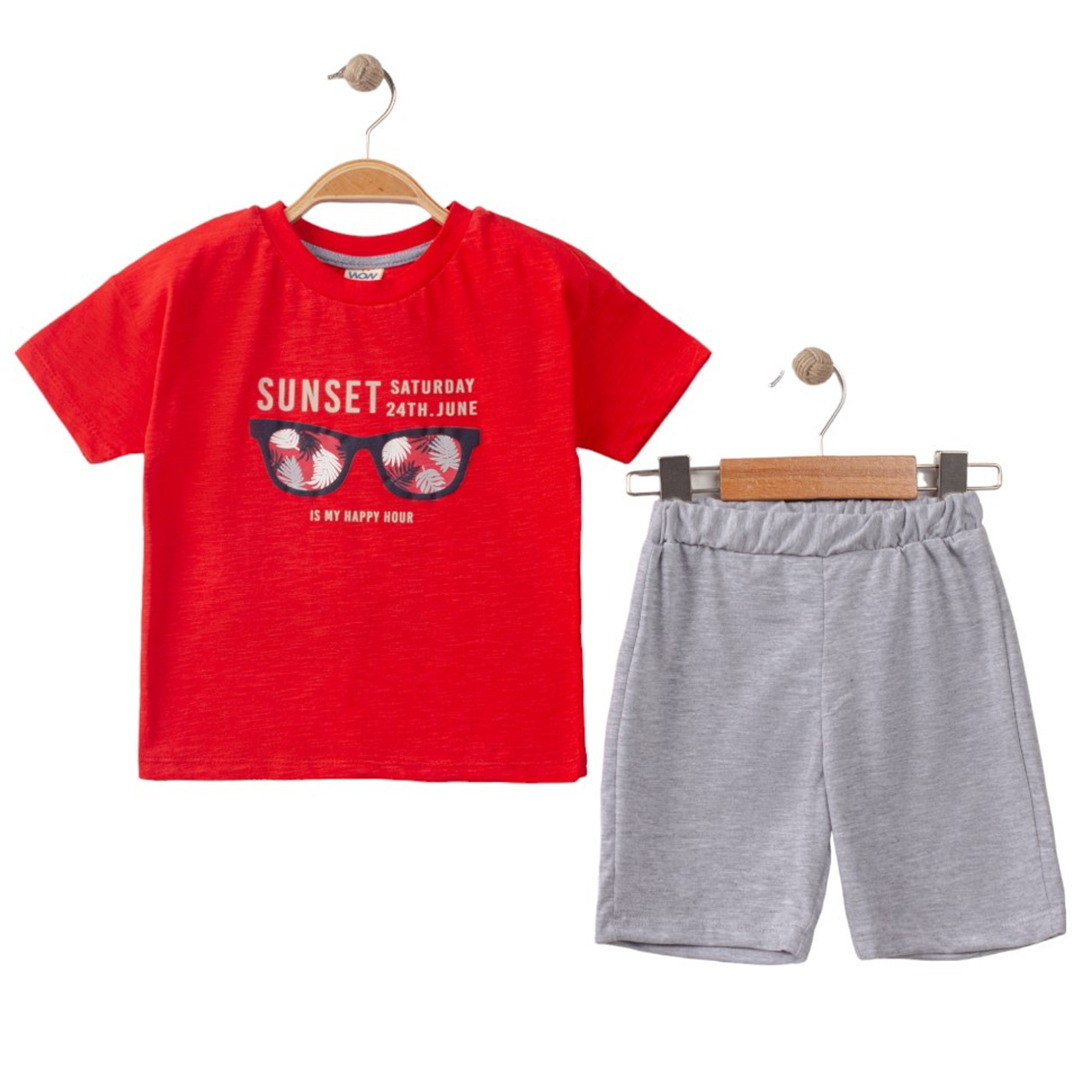 Erkek Bebek Kırmızı Gri Gözlük Baskılı Şortlu 2'li Takım