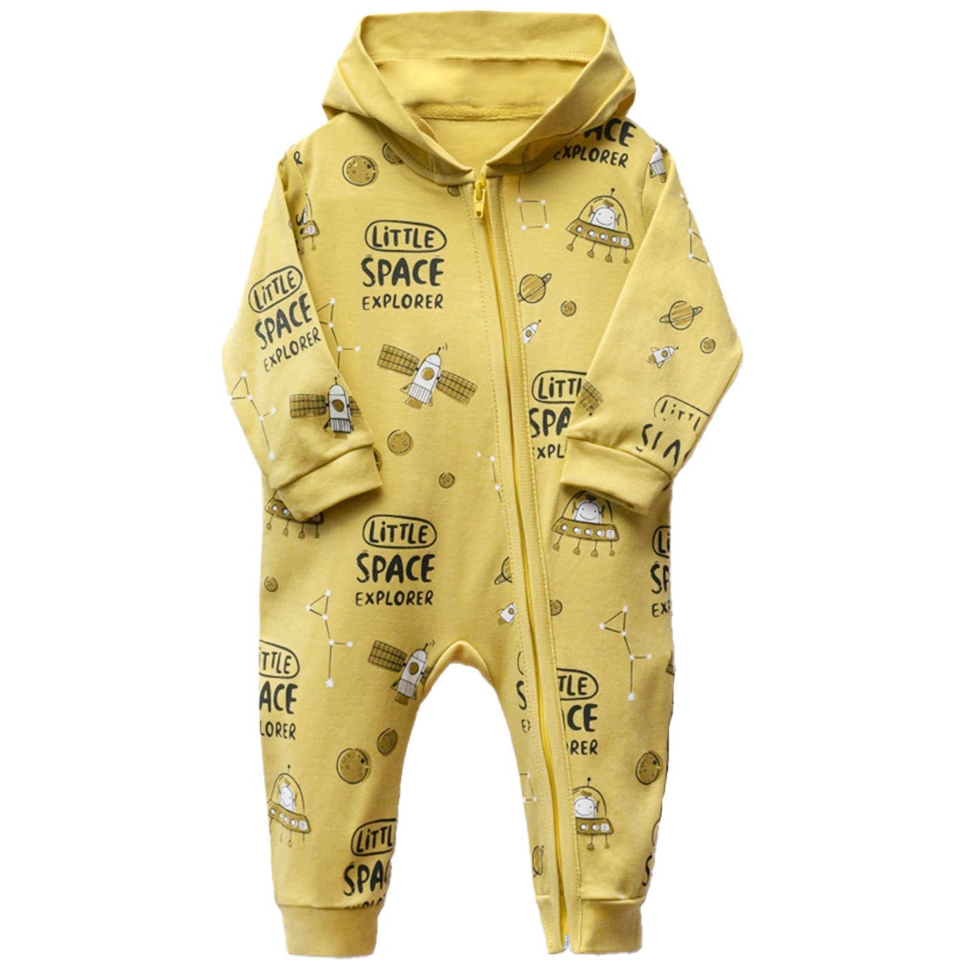 Erkek Bebek Sarı Uzay Baskılı Fermuarlı Kapüşonlu Tulum