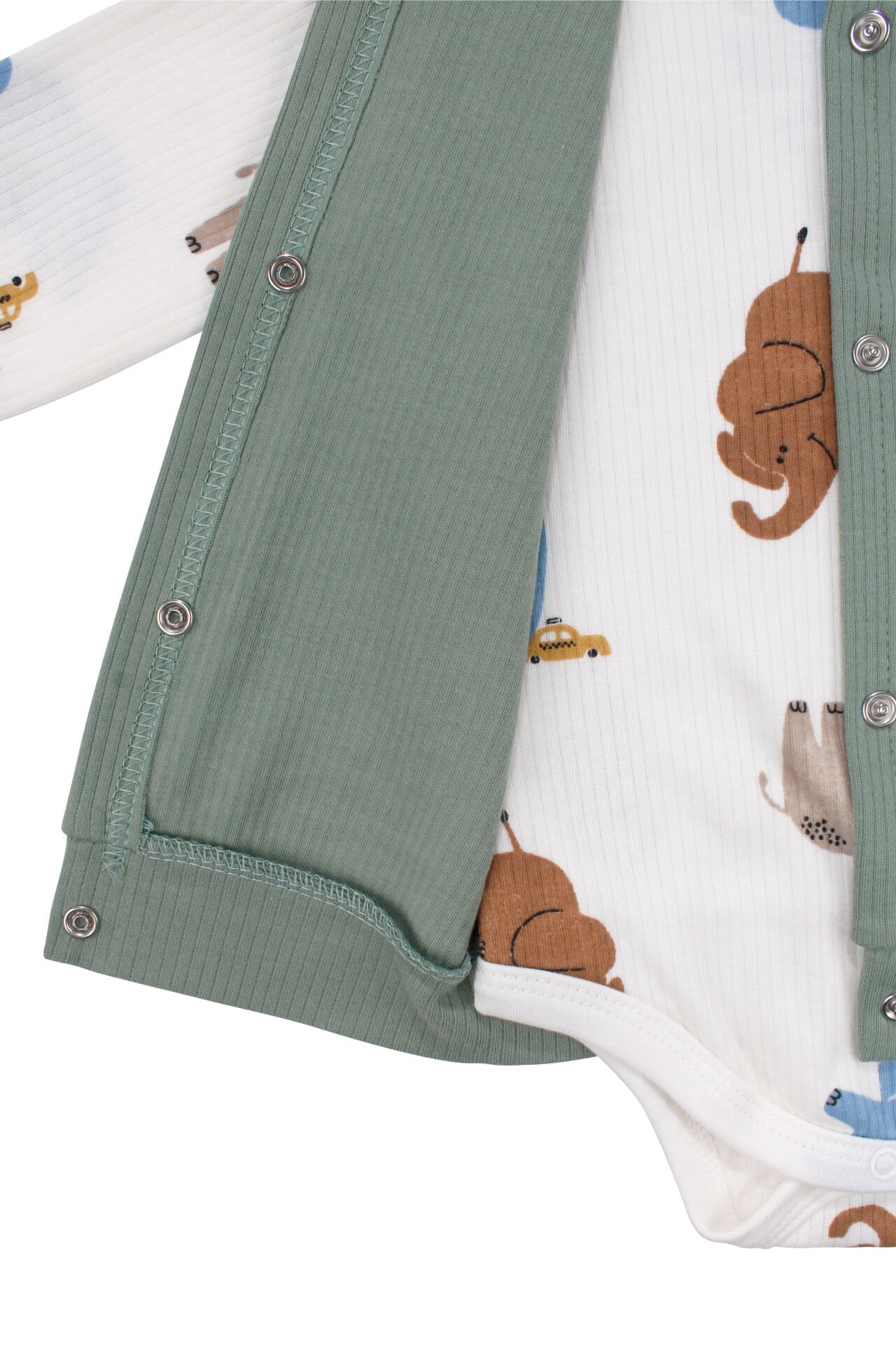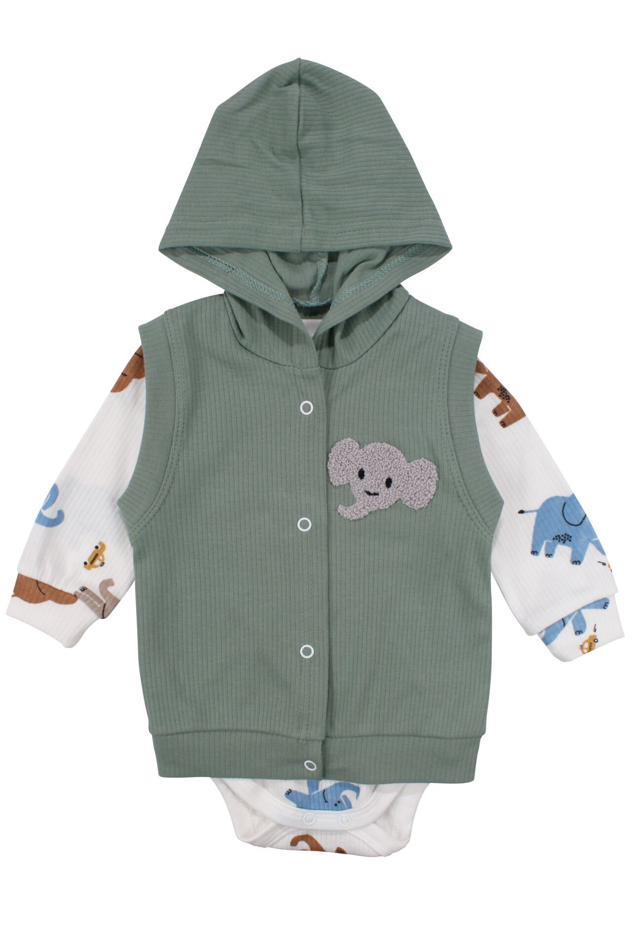 ERKEK BEBEK YEŞİL EKRU FİL NAKIŞLI YELEKLİ 3’LÜ TAKIM