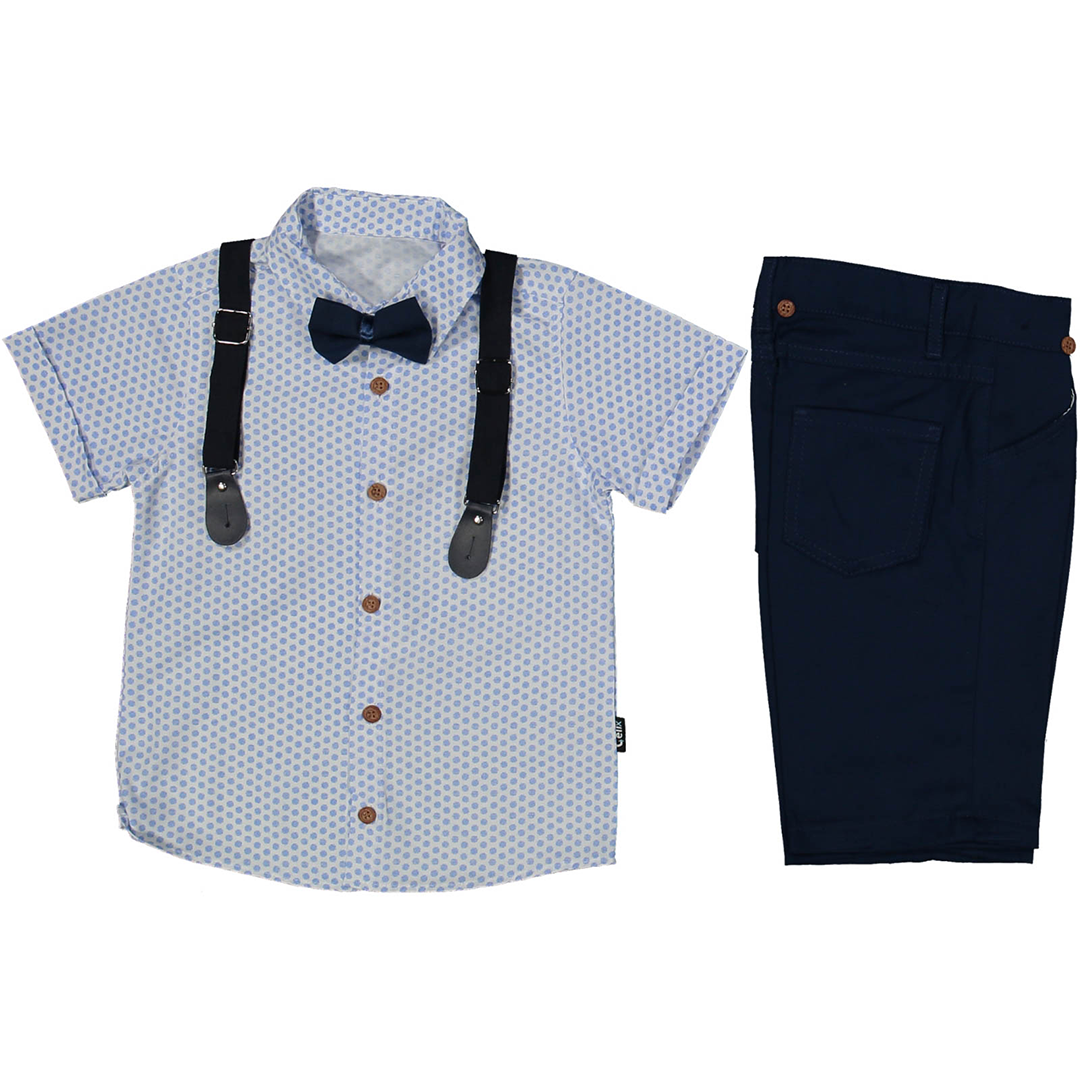 Erkek Çocuk Beyaz Mavi Laci Desenli Gömlekli Papyonlu Askılı Kısa Kol 3'lü Takım