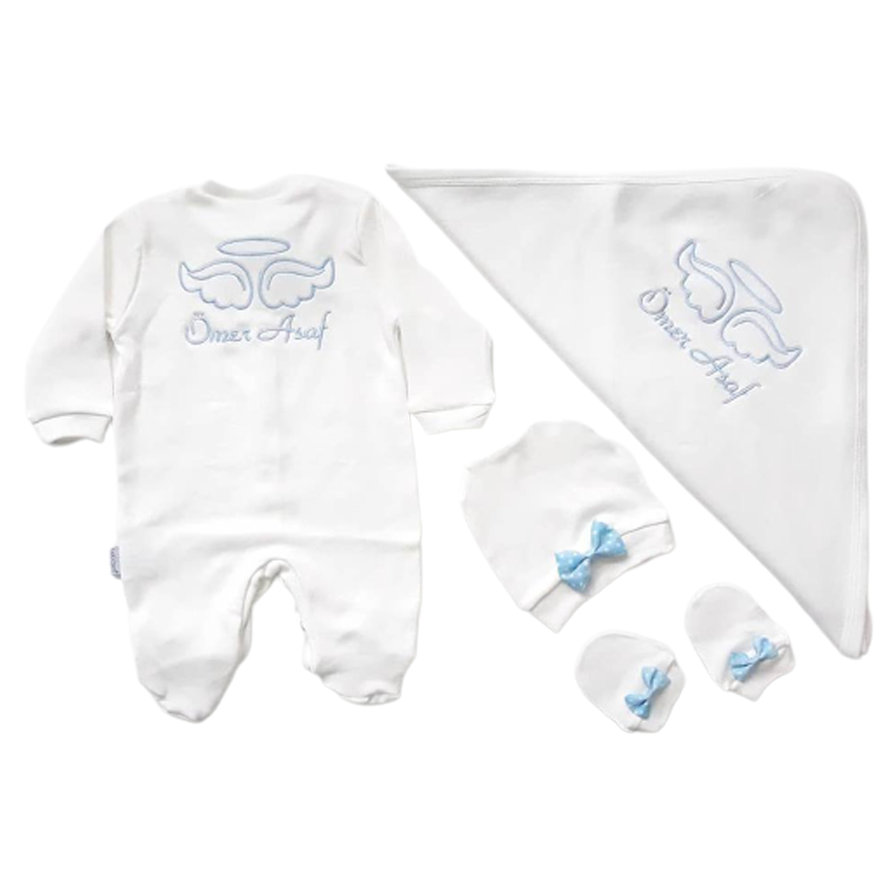 İsme Özel Mavi Nakışlı Bereli Eldivenli Erkek Bebek Tulum + Battaniye