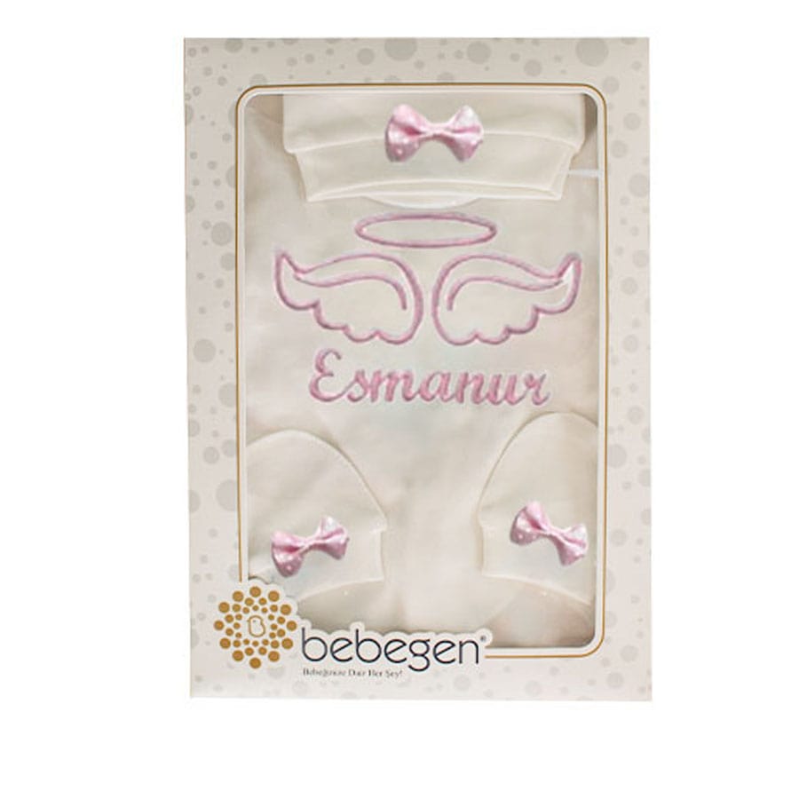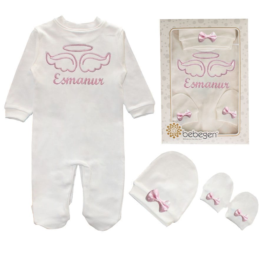 İsme Özel Pembe Nakışlı Bereli Eldivenli Kız Bebek Tulum