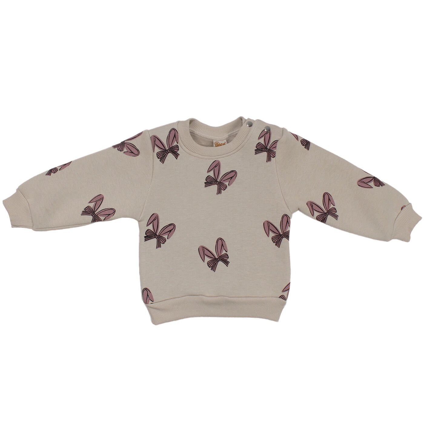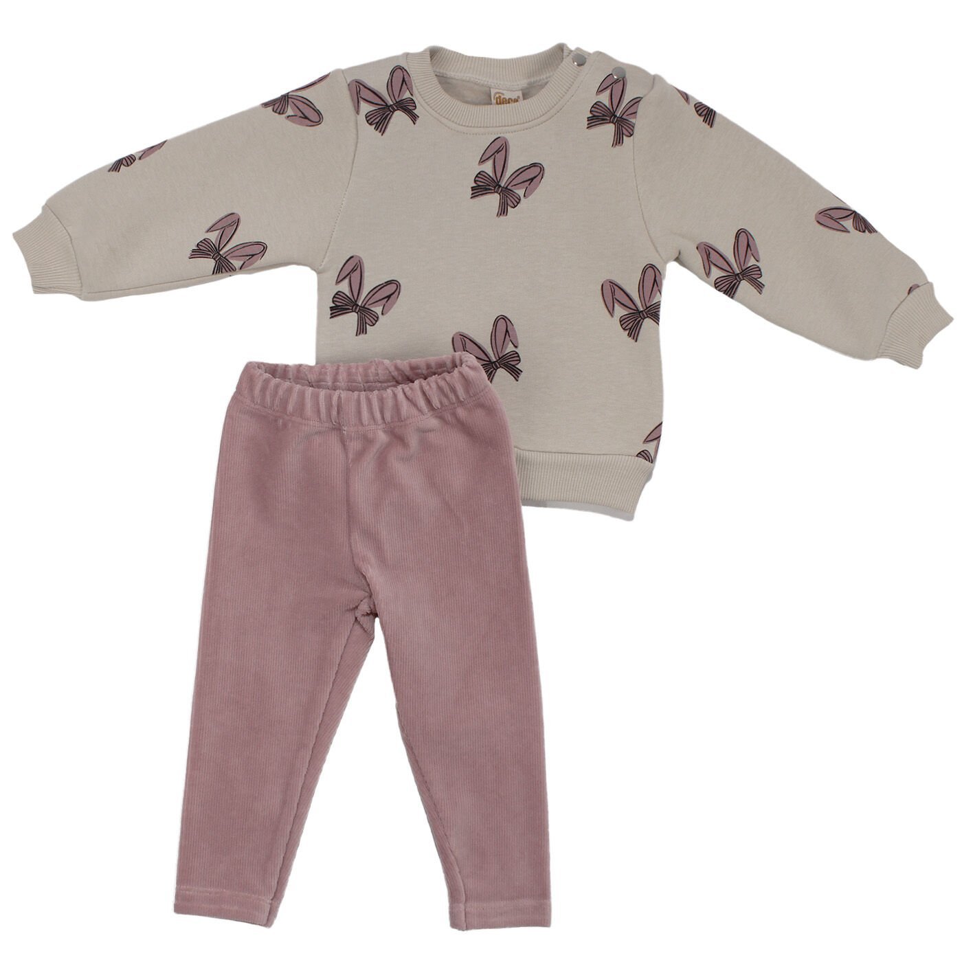 Kız Bebek Bej Lila Fiyonklu Baskılı Kadife Fitillli Taytlı 2'li Takım