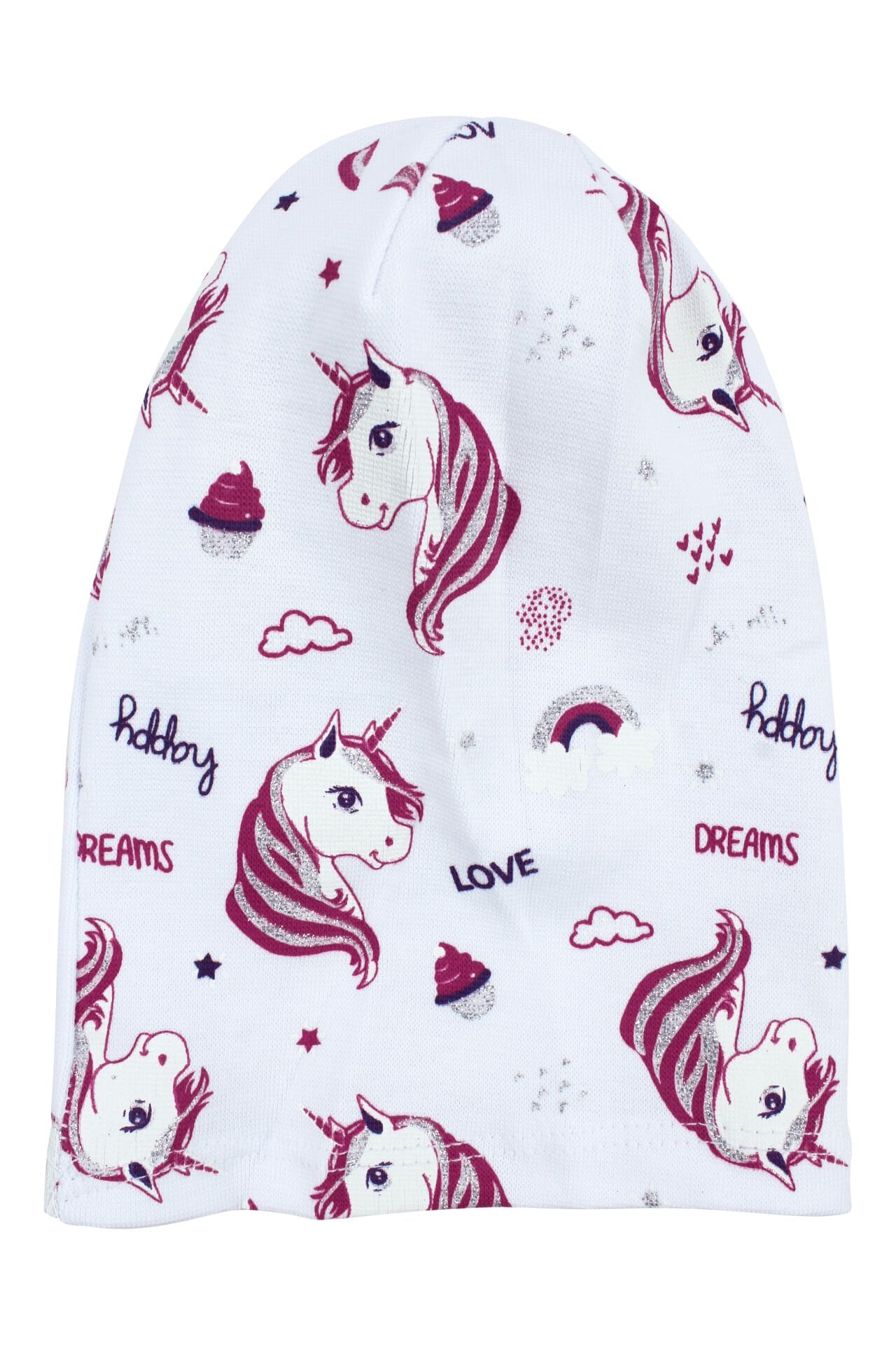 Sevimli ve dikkat çekici tasarımıyla öne çıkan bu bere, beyaz zemin üzerinde yer alan gri simli ve pembe unicorn deseni ile şık ve eğlenceli bir görünüm sunar. Simli detaylar tasarıma ışıltılı bir dokunuş kazandırırken, unicorn figürü ürüne sevimli bir karakter kazandırır.