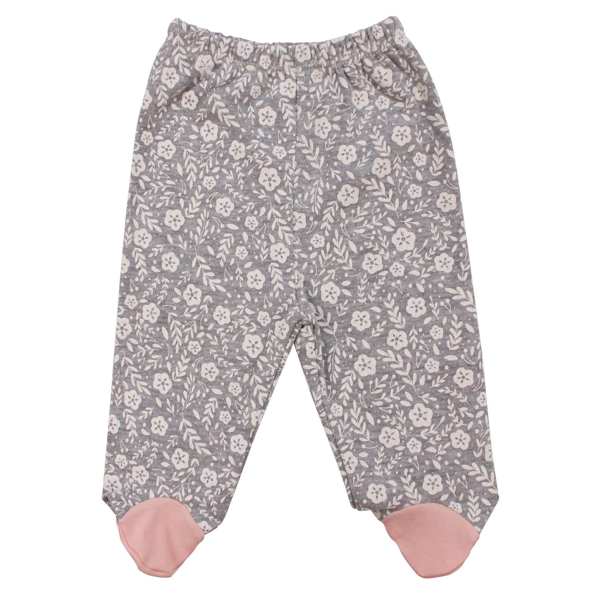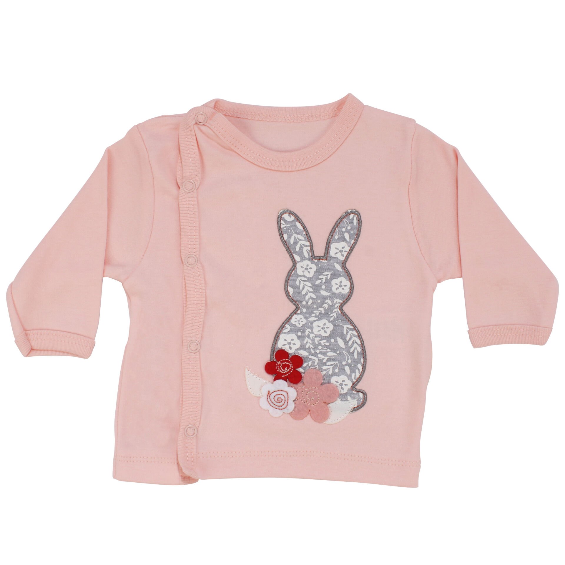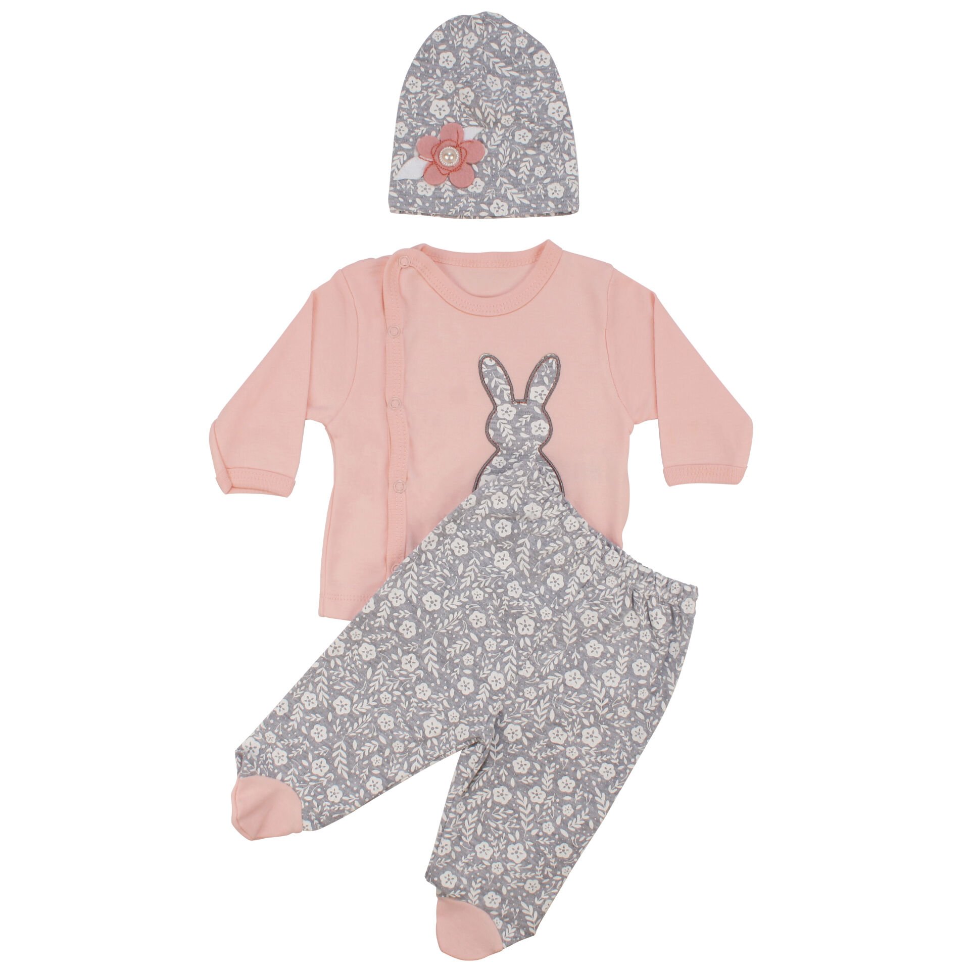 Kız Bebek Çiçekli Tavşan Nakışlı Somon Gri 3'lü Hastane Çıkış Seti