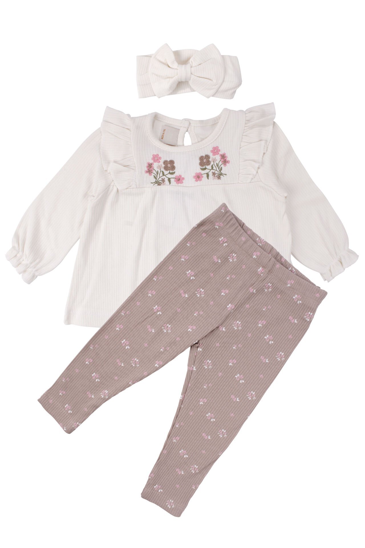 Kız Bebek Ekru Bej Çiçek Nakışlı Bandanalı Üçlü Takım