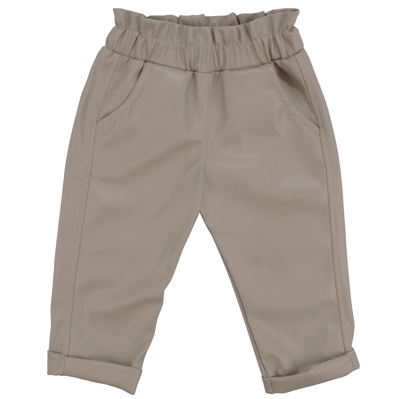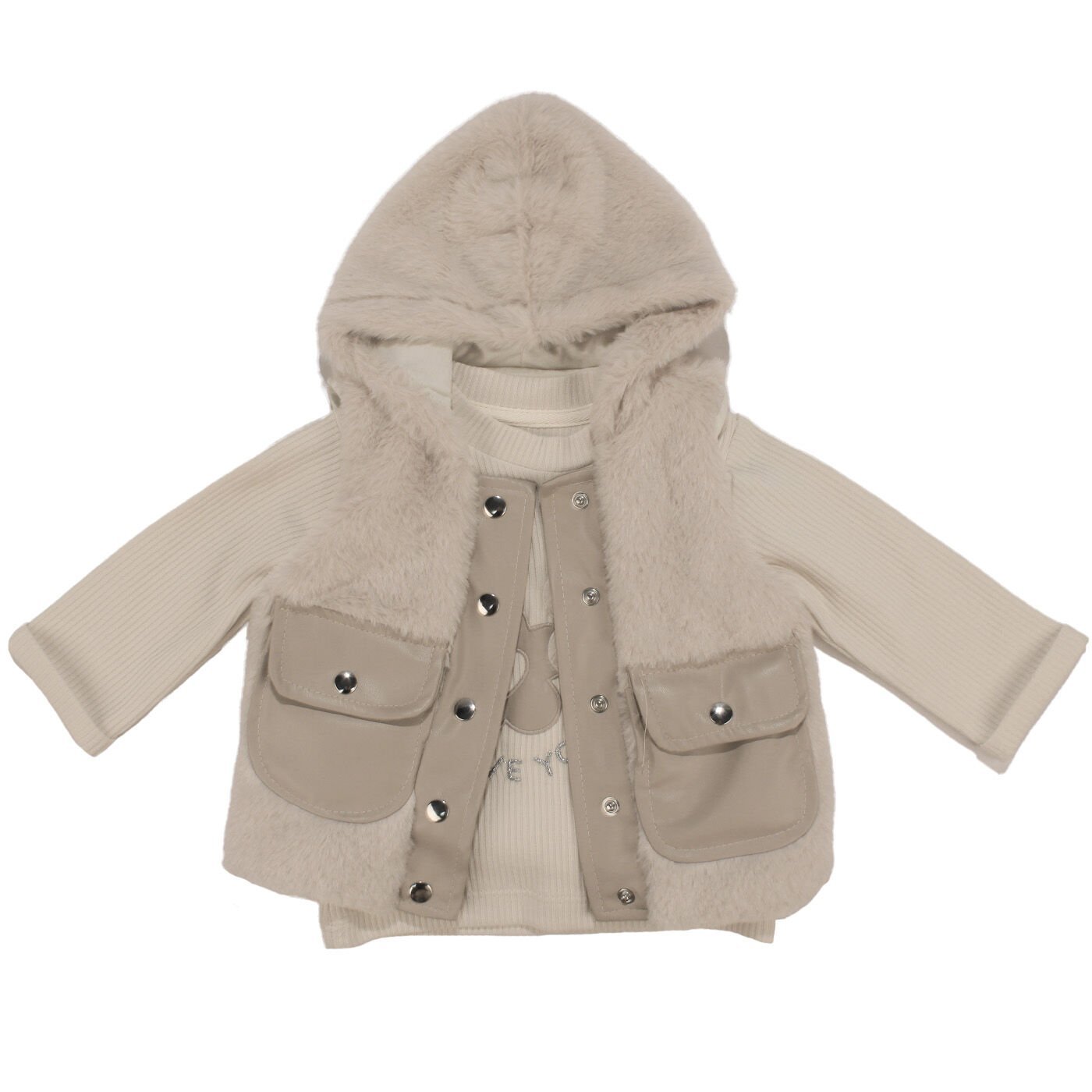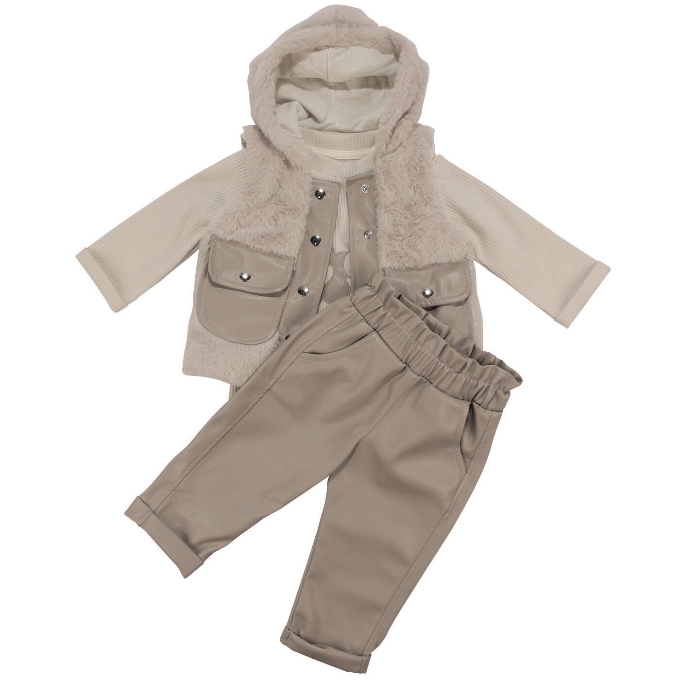 Kız Bebek Ekru Bej Peluş Yelekli Deri Pantalonlu Üçlü Lüks Takım