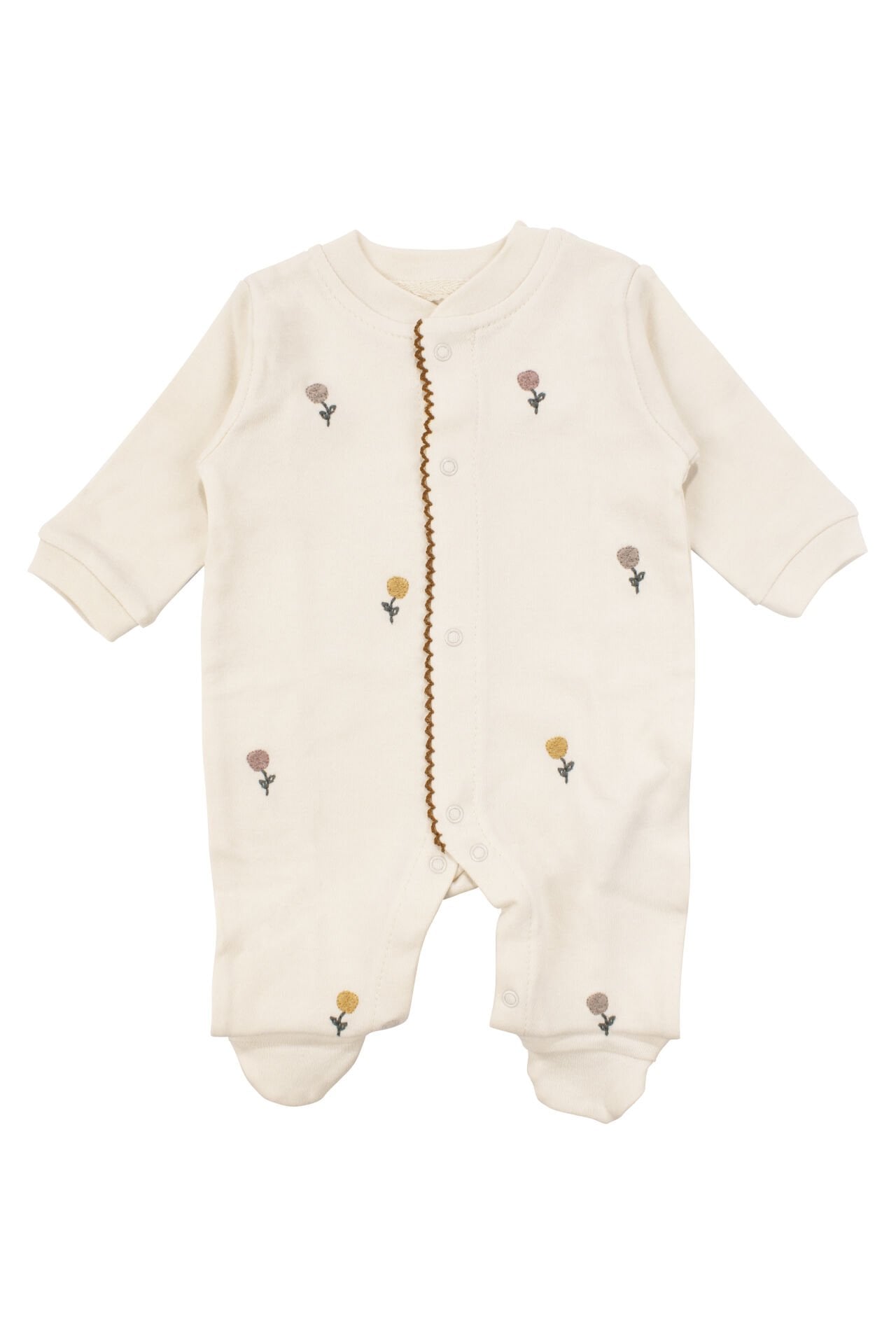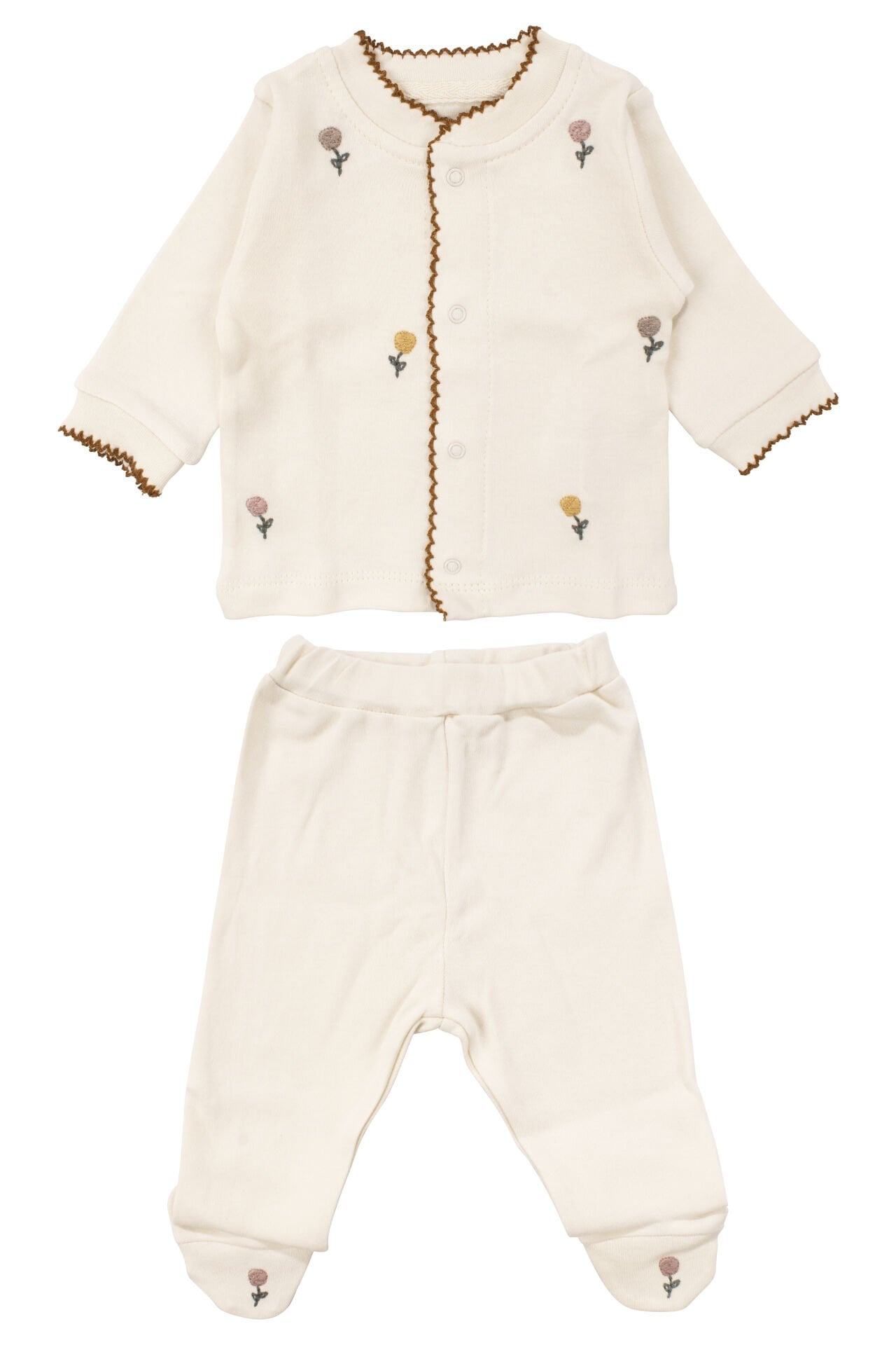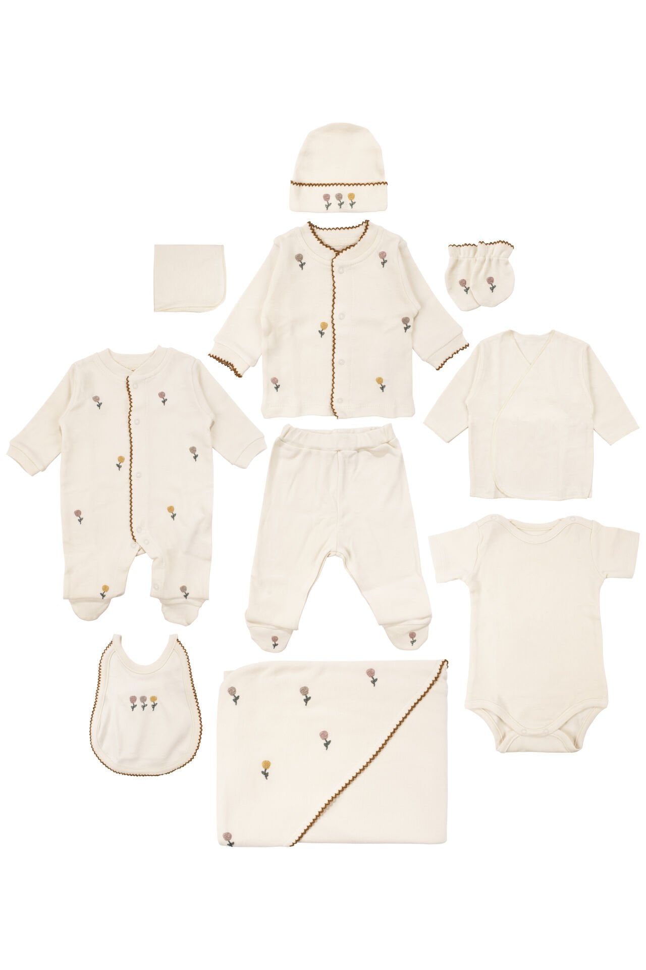 Kız Bebek Ekru Çiçek Nakışlı Biyeli Organik Lüks 10 Parça Hastane Çıkış Seti