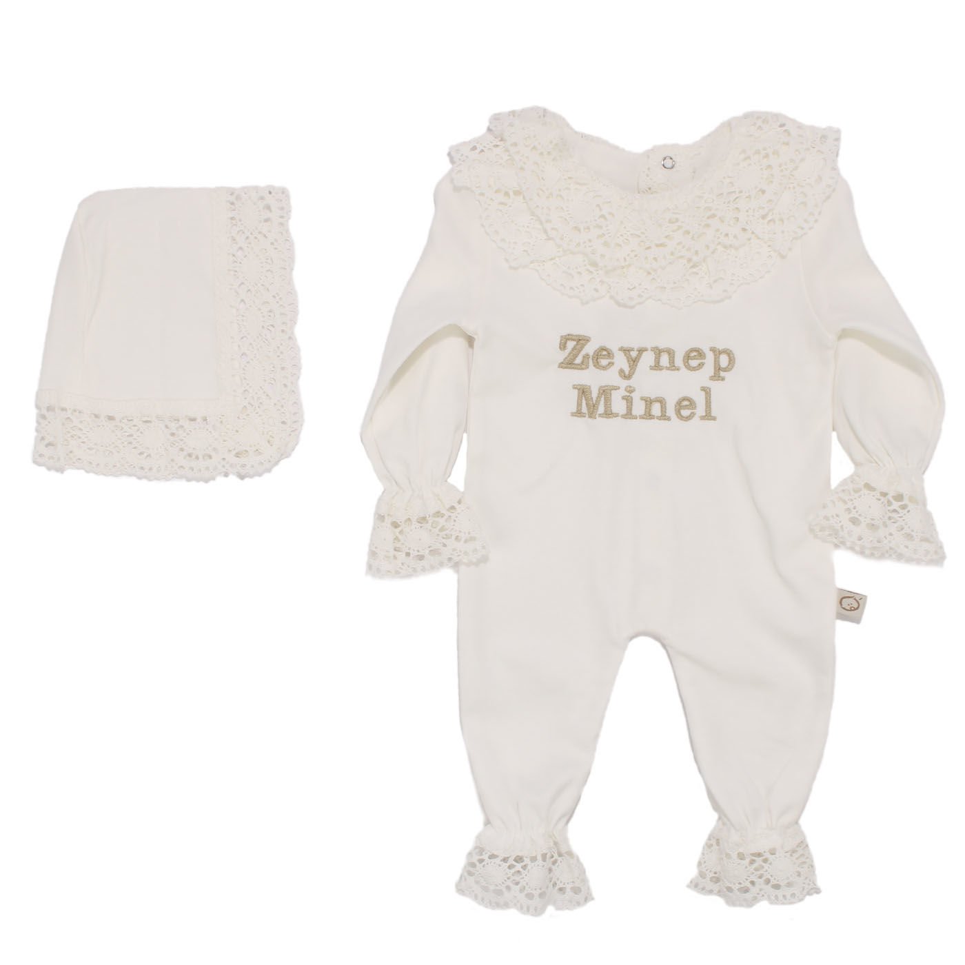 Kız Bebek Ekru Fisto Dantelli Bereli İsme Özel Tulum 0-3 Ay