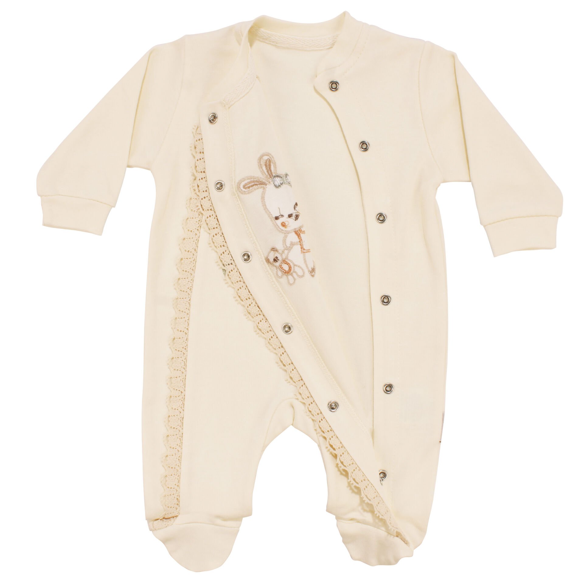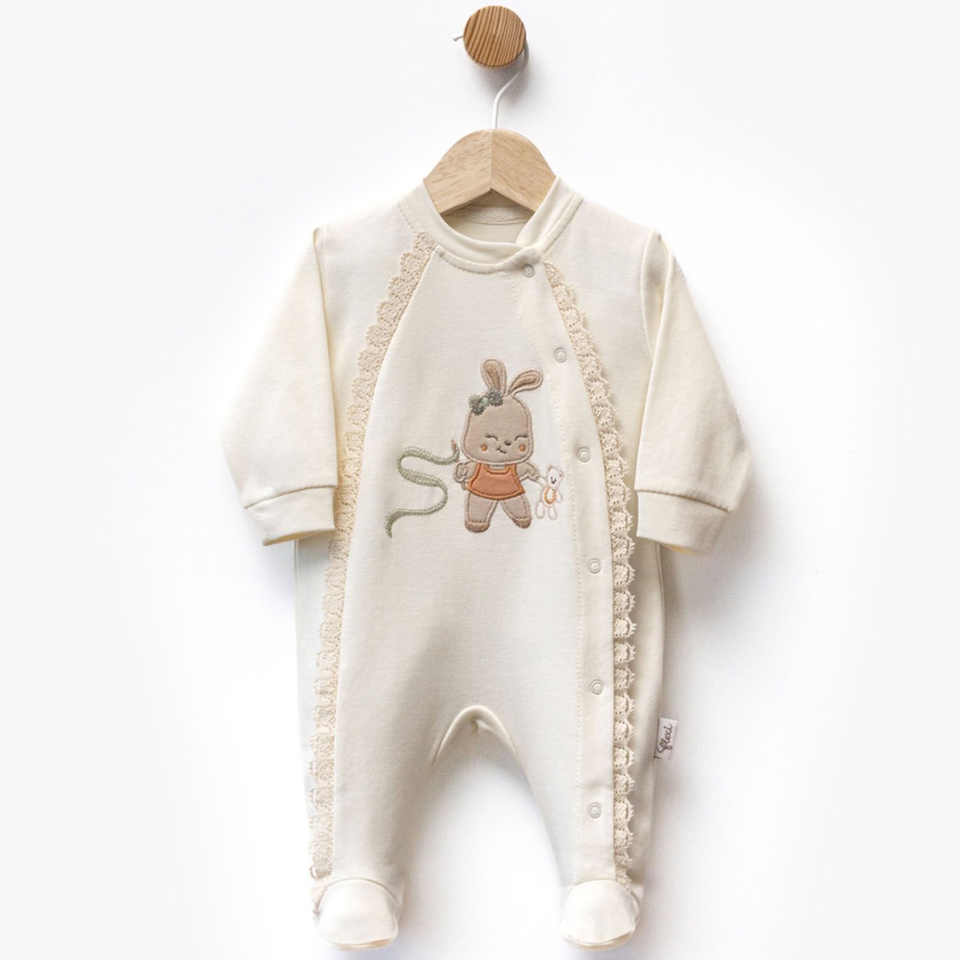 Kız Bebek Ekru Fistolu Tavşanlı Desenli Çıtçıtlı Patikli Tulum