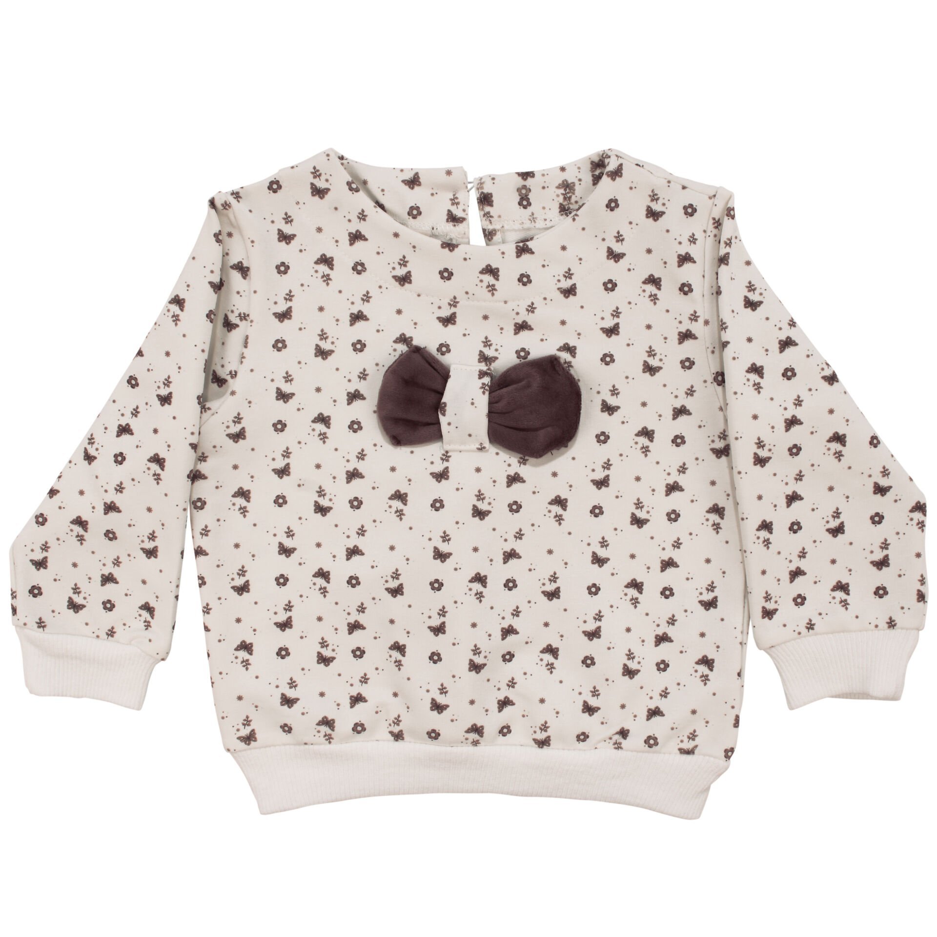 Üst kısmındaki kelebek deseni, takıma tatlı ve dikkat çekici bir detay katar. Alt kısmın kadife pantolon tasarımı, modern ve kullanışlı bir görünüm sunar. Ekru ve kahve renk kombinasyonu, minik bebekler için zarif ve doğal bir şıklık oluşturur.