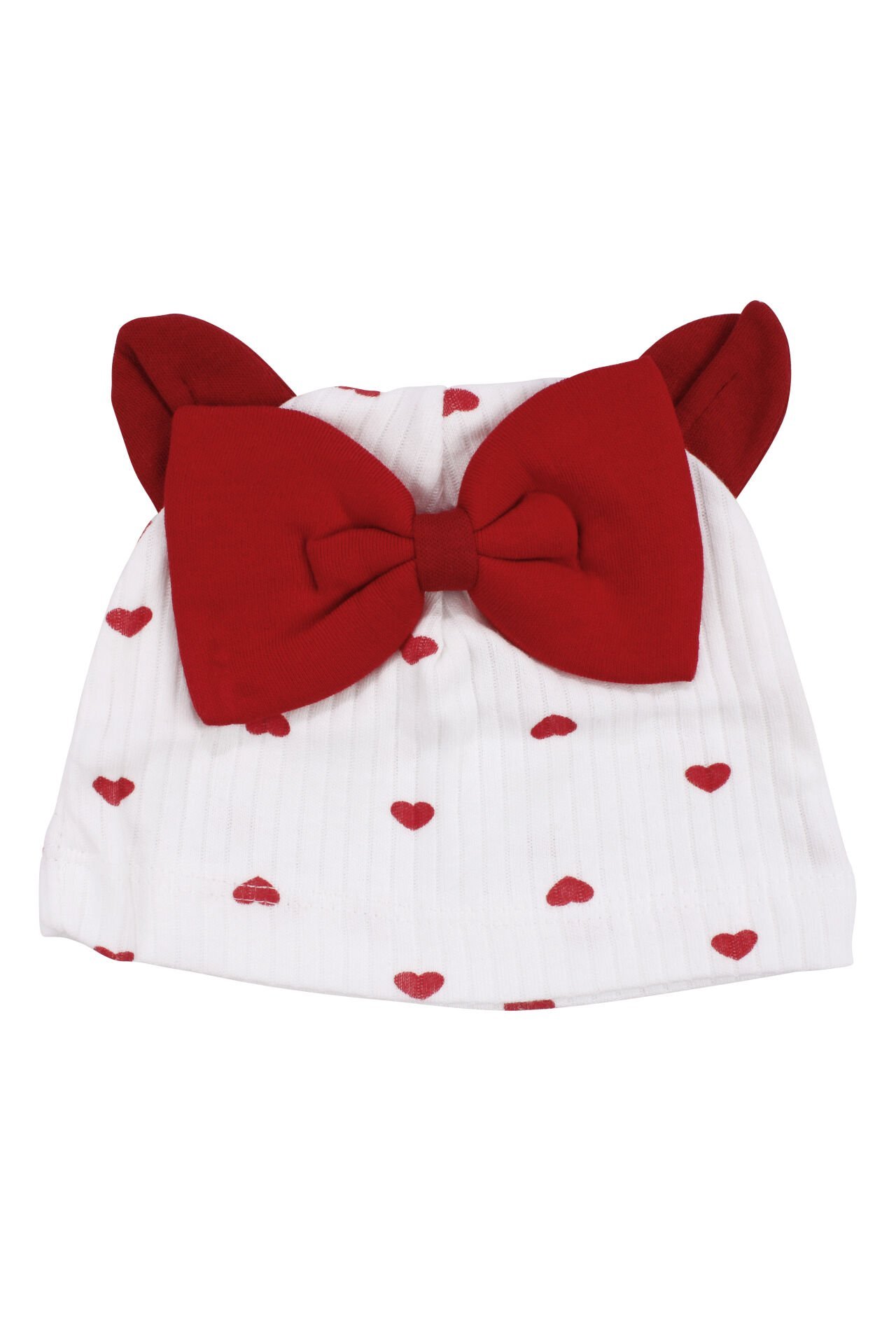 Kız Bebek Ekru Kırmızı Kalp Desenli Fiyonklu Bereli Zıbın Takım