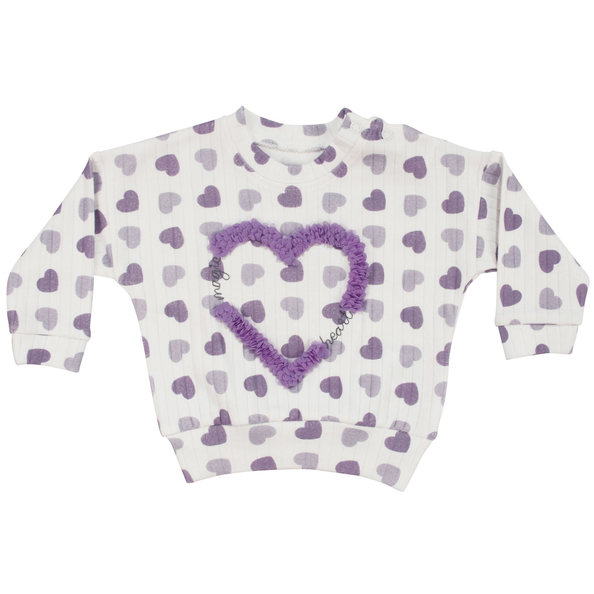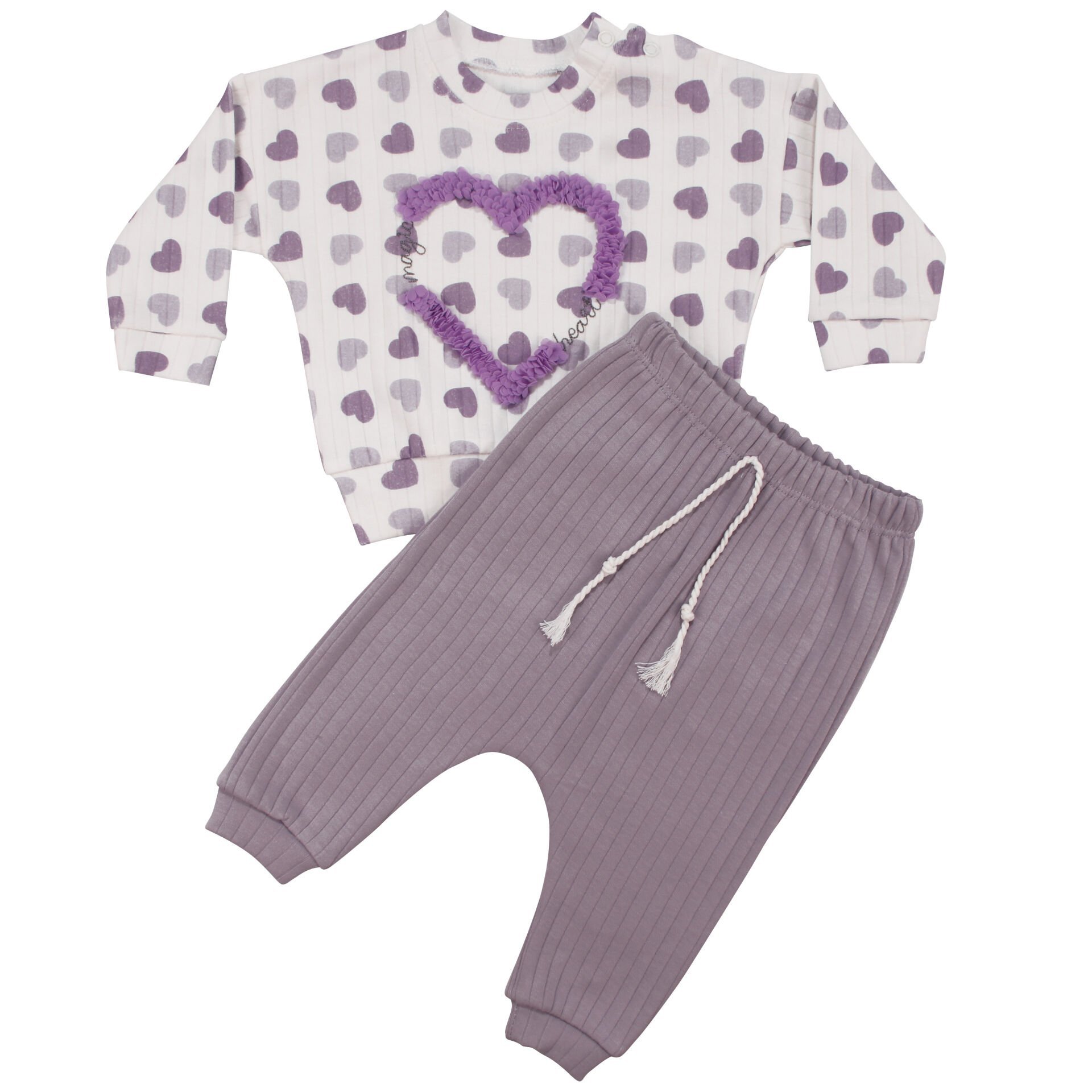Kız Bebek Ekru Lila Kalpli Desenli Fitilli 2'li Takım