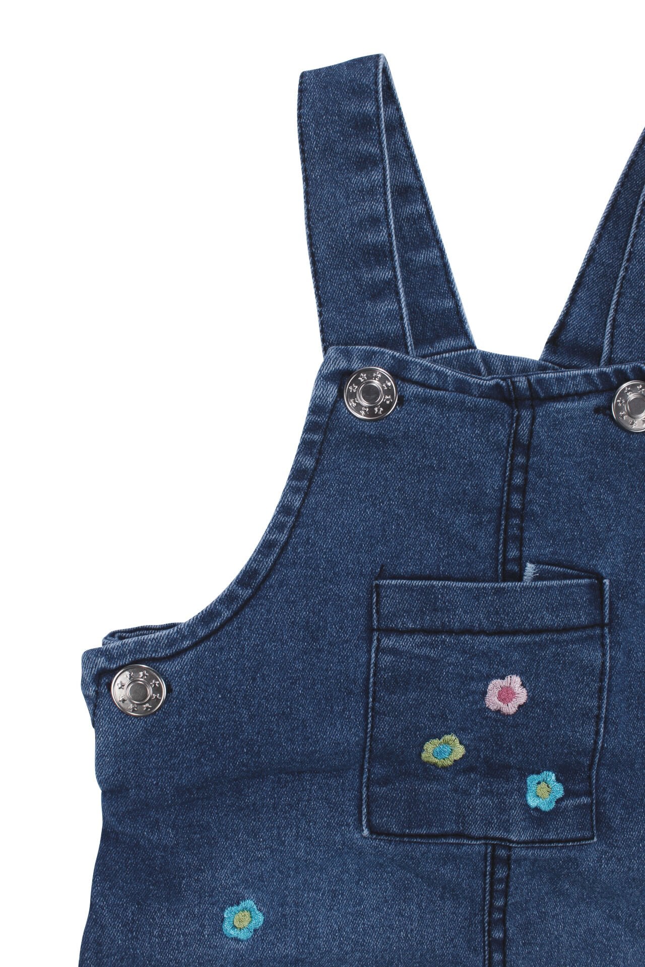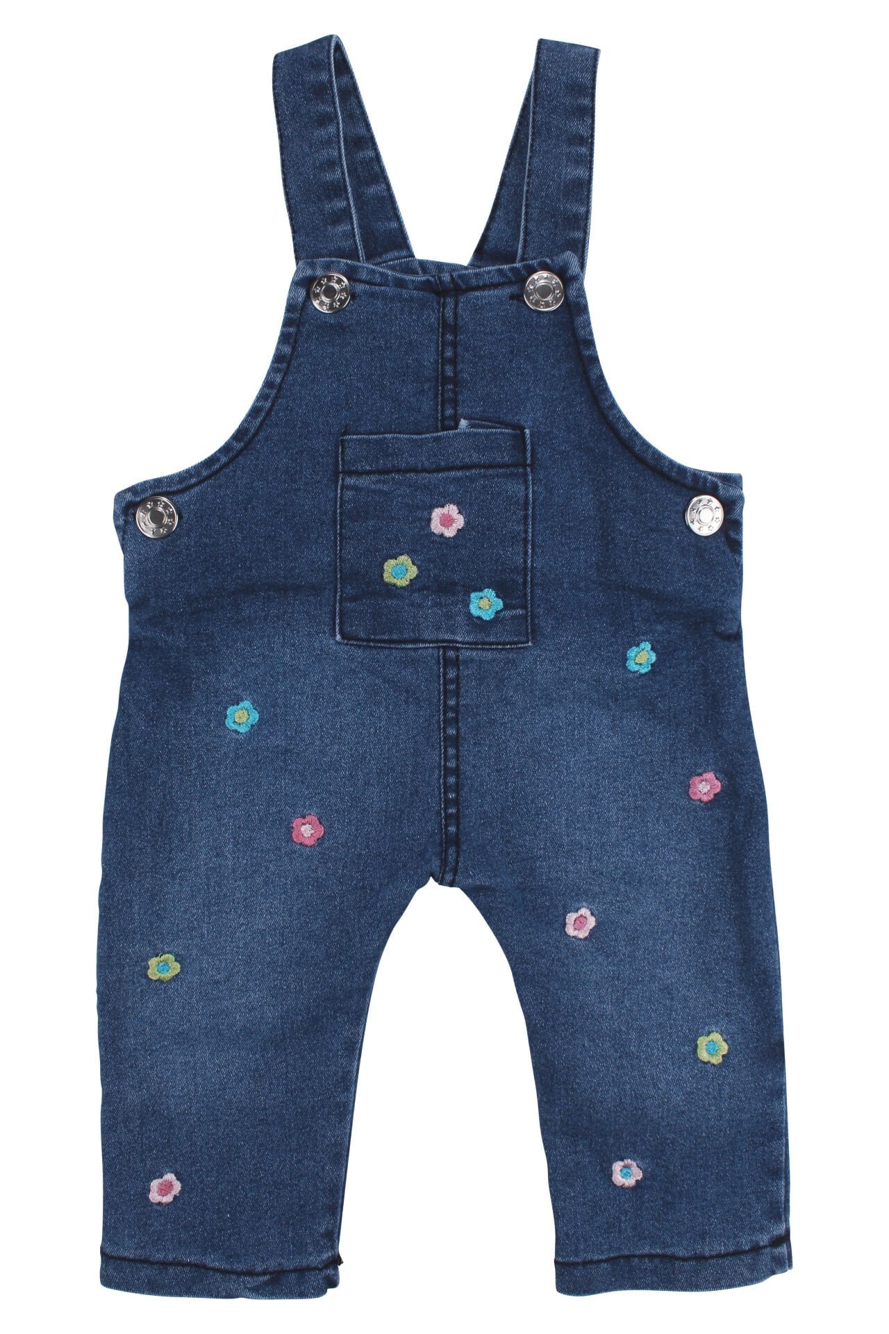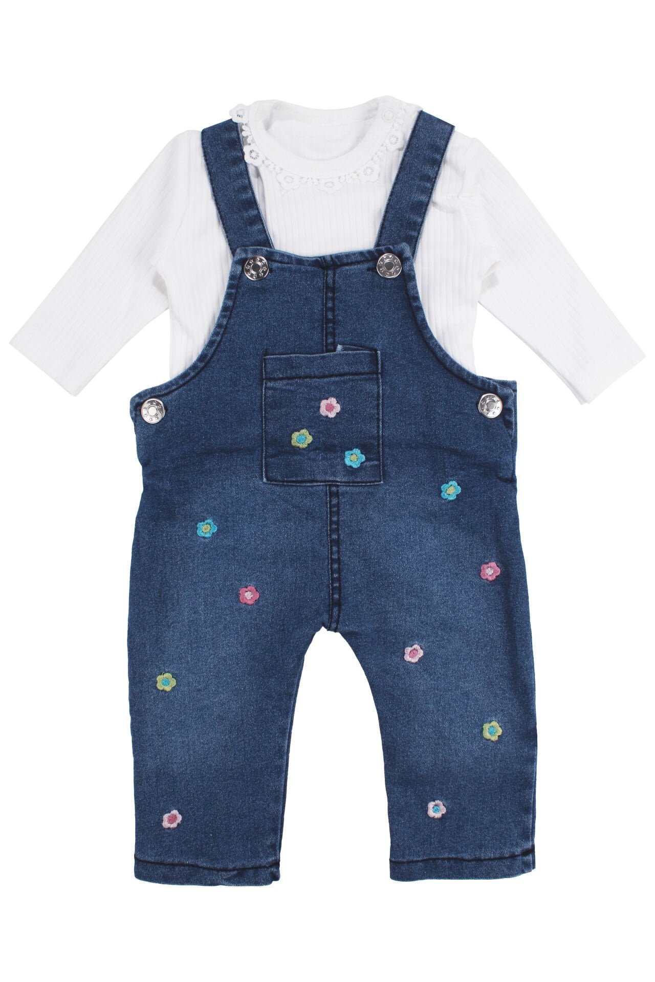 Kız Bebek Ekru Mavi Renkli Çiçek Nakışlı Badili Kot Salopet Tulum