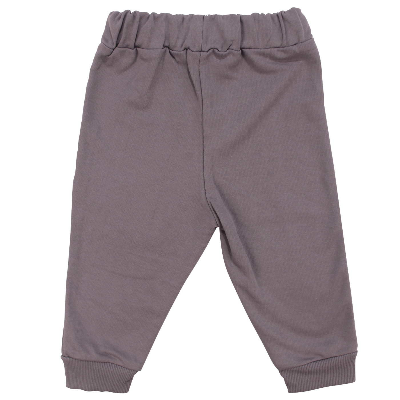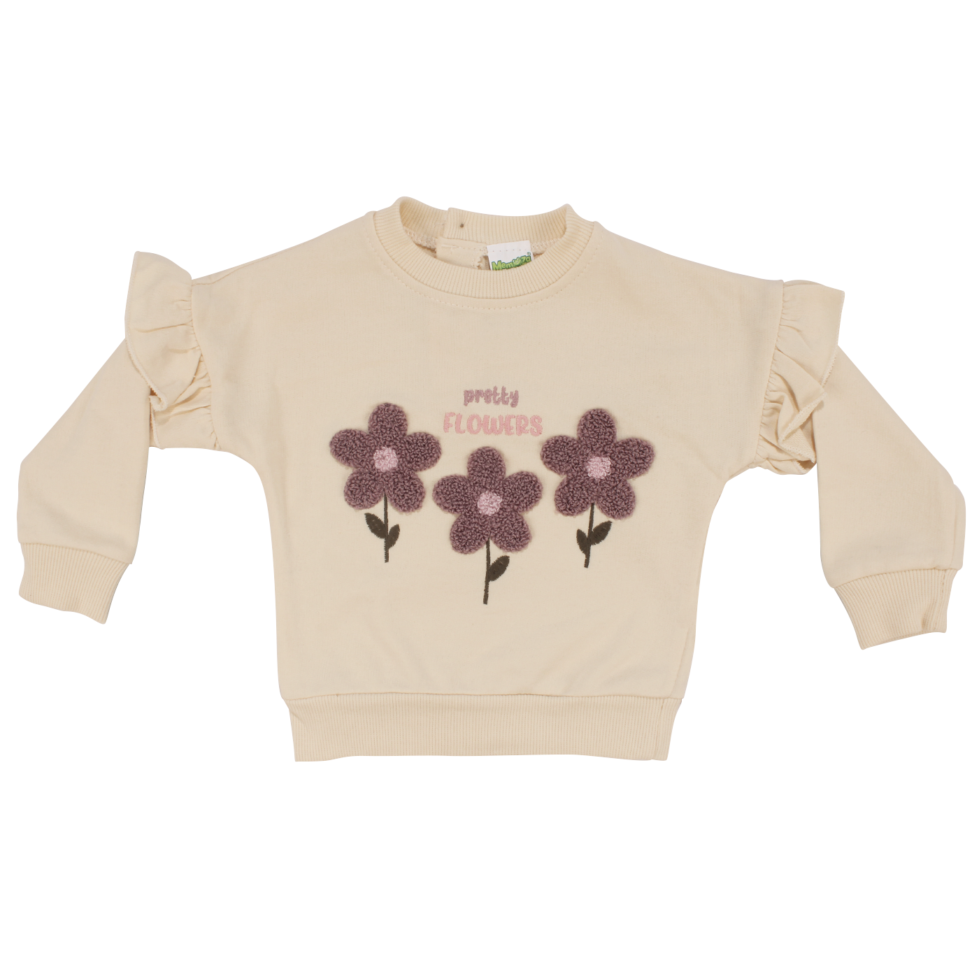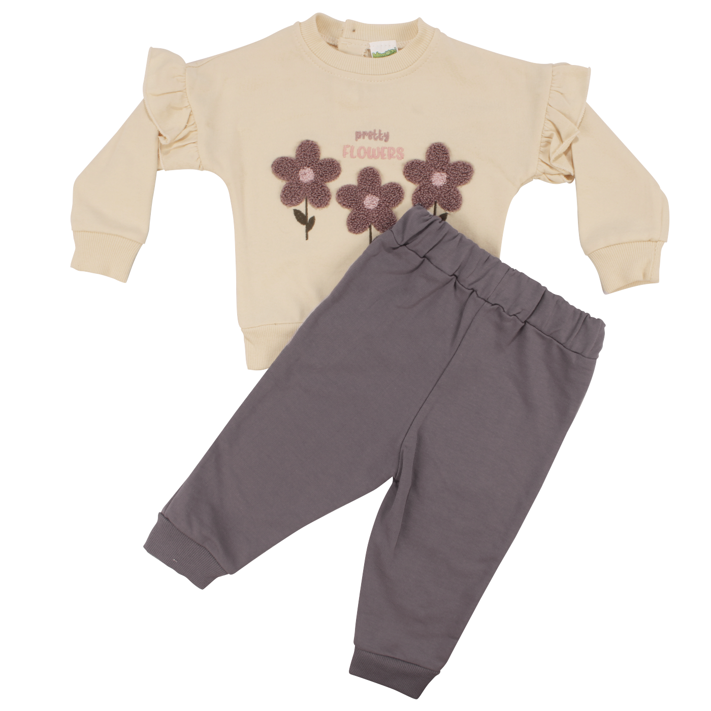 Üst kısmındaki çiçek nakışı, takıma zarif ve dikkat çekici bir detay katar. Ekru ve mor renk kombinasyonu, miniklere modern ve neşeli bir görünüm sağlar.