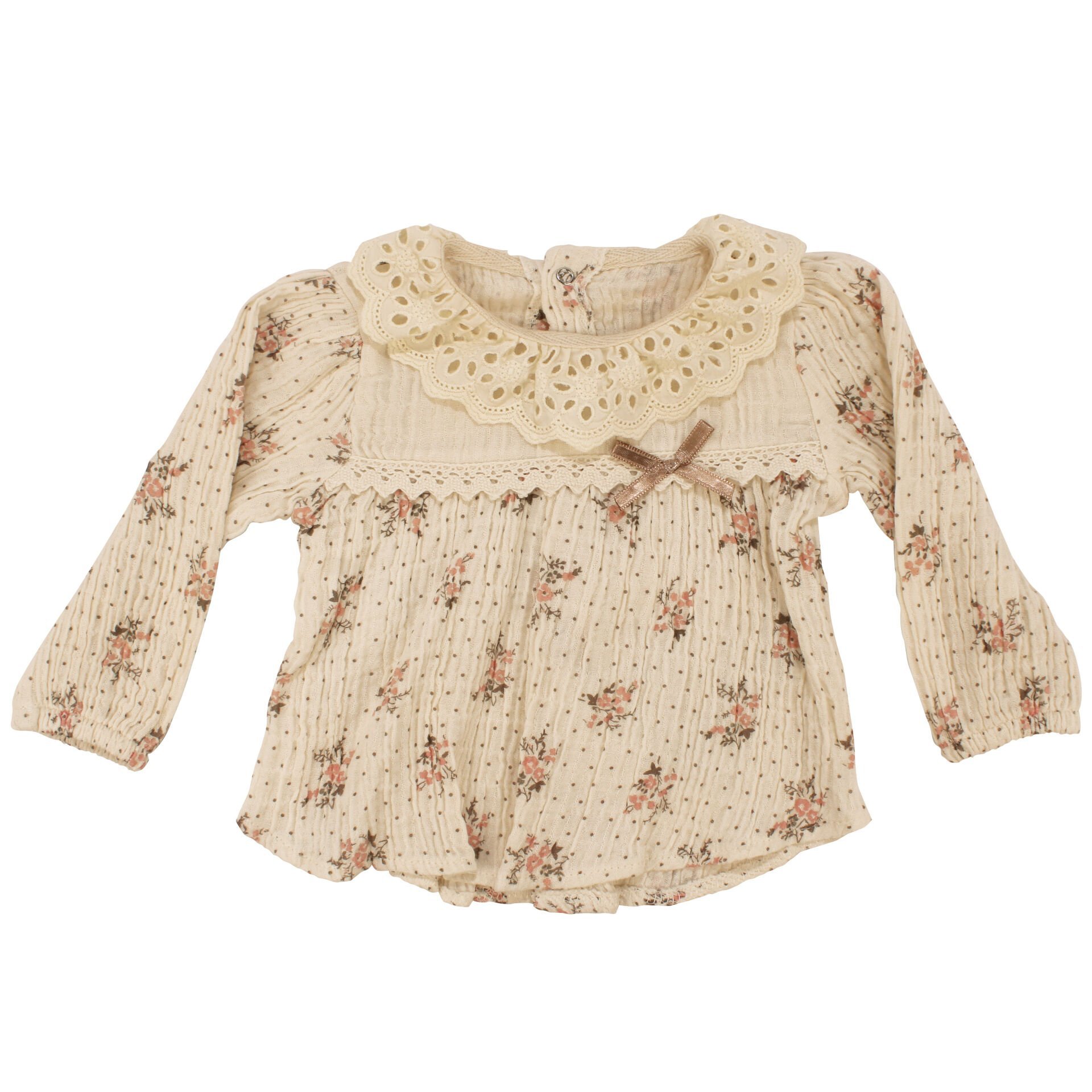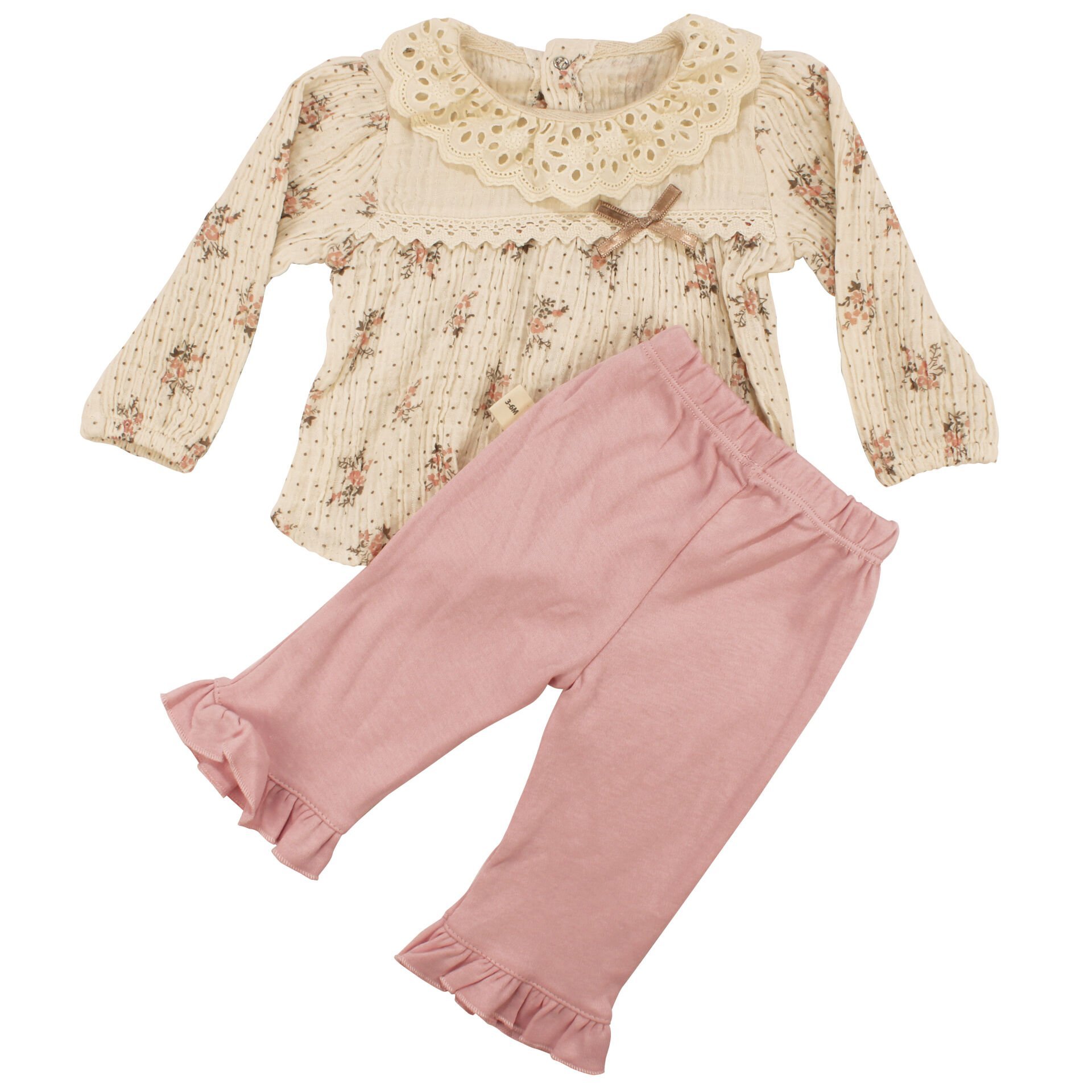 Kız Bebek Ekru Pembe Çiçek Desenli Fistolo 2'li Takım
