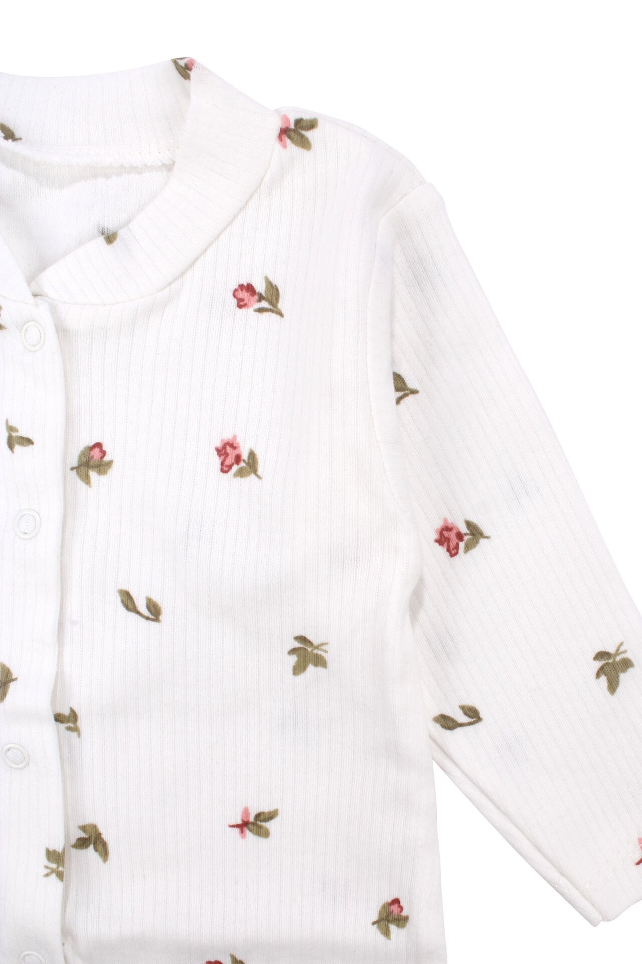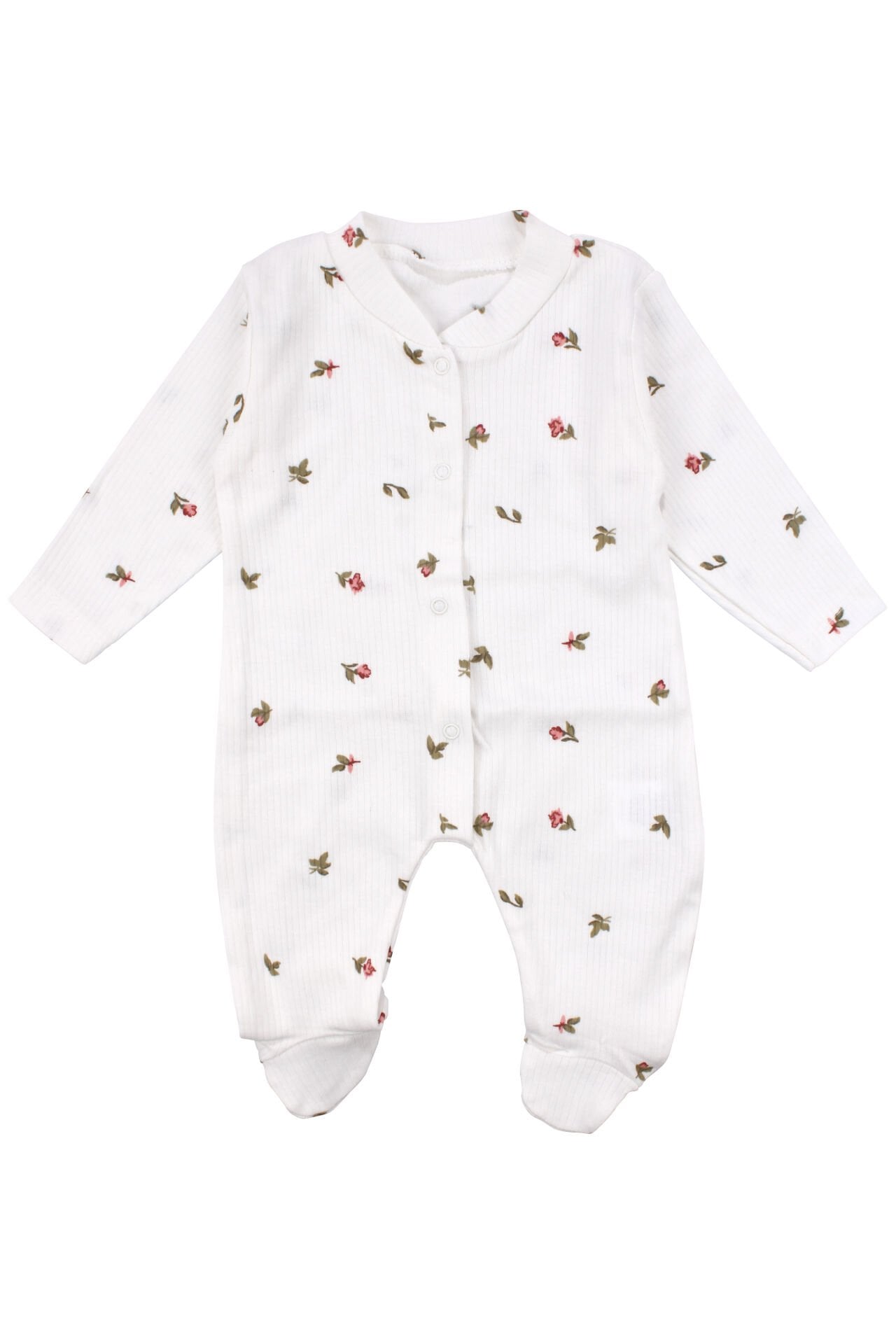 Şıklığı ve konforu bir arada sunan bu tulum, ekru zemin üzerine pembe gül desenleri ile kız bebeğinize hem sevimli hem zarif bir görünüm kazandırır. Fitilli manşetler ve patikli tasarımı, ekstra sıcaklık sağlar; kolları, bacakları ve ayakları nazikçe sararak gün boyu rahat kullanım sunar. Alttan çıtçıtlı kapanış, ebeveynler için kolay giydirme ve bez değiştirme imkânı sağlar.