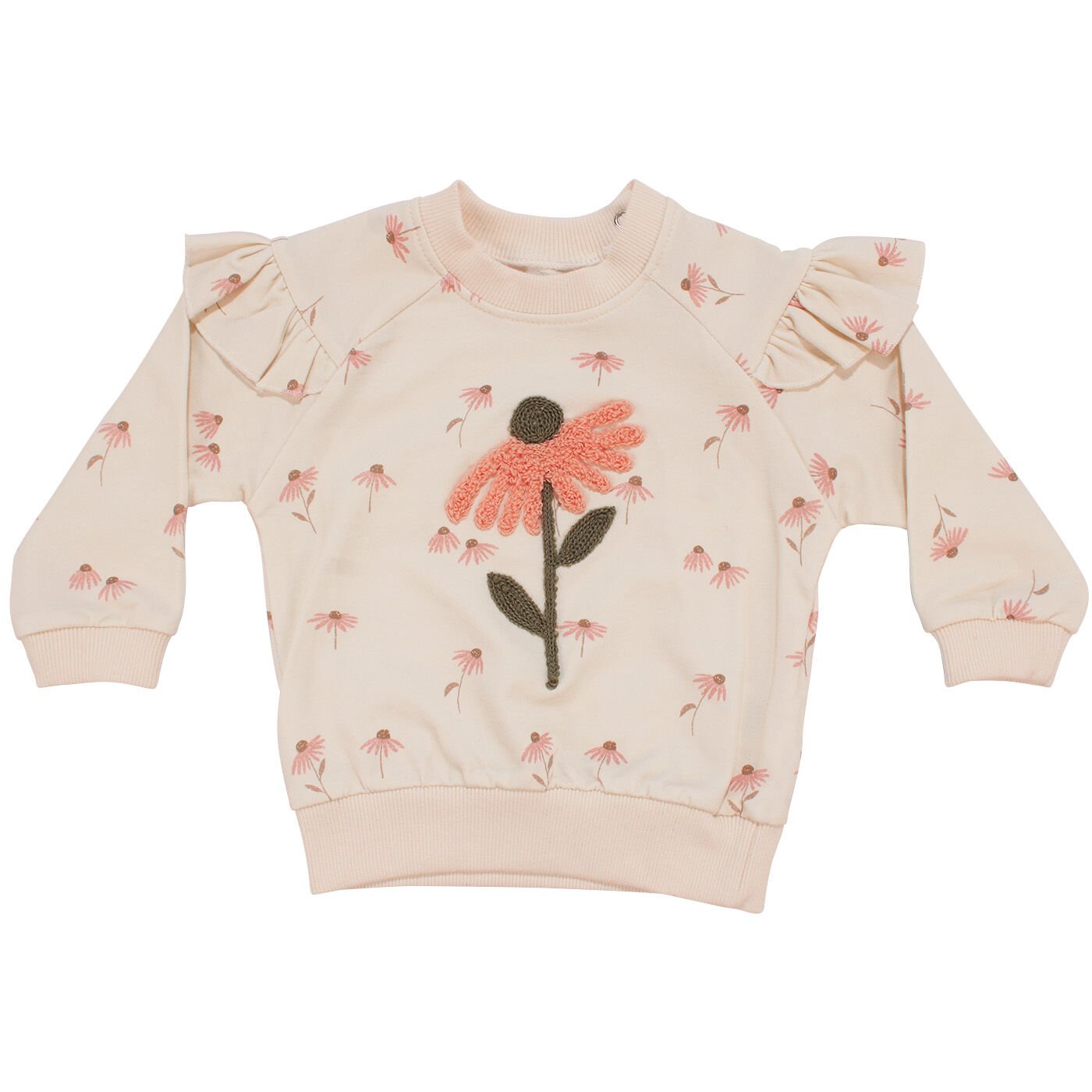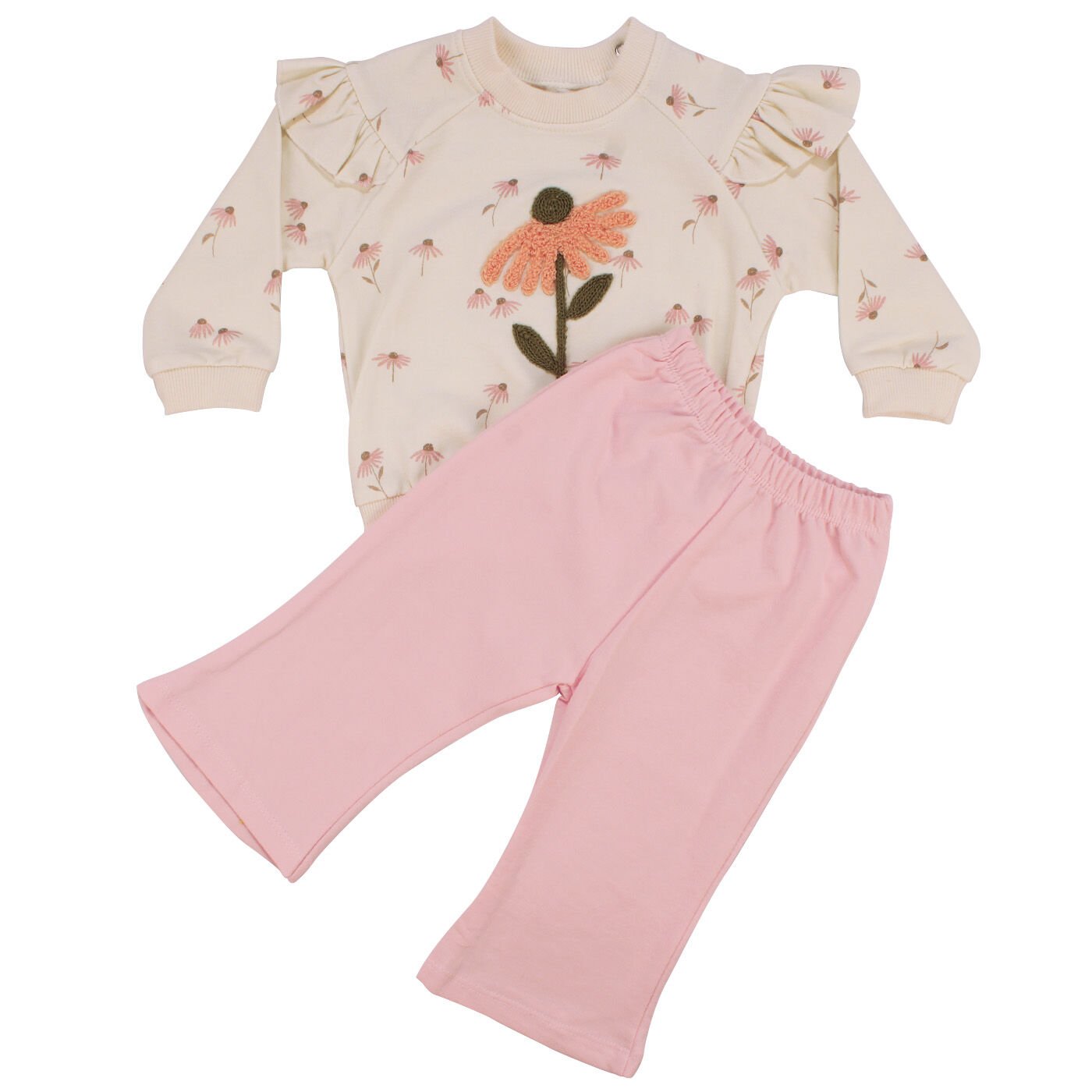 Üst kısmındaki papatya nakışı ve fırfırlı kollar, takıma zarif ve tatlı bir detay ekler. Ekru ve pembe renk kombinasyonu, miniklere neşeli ve şık bir görünüm sunar.