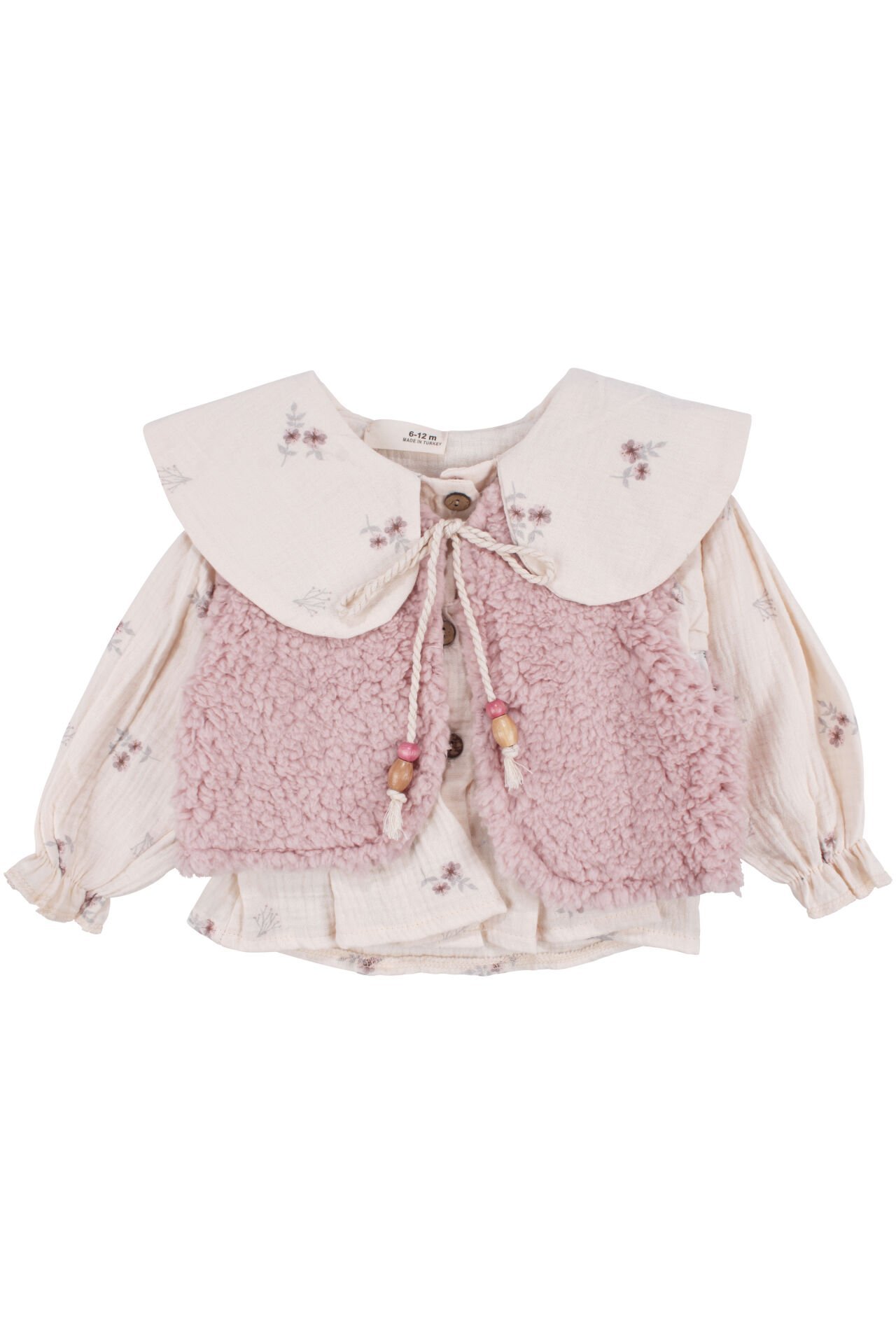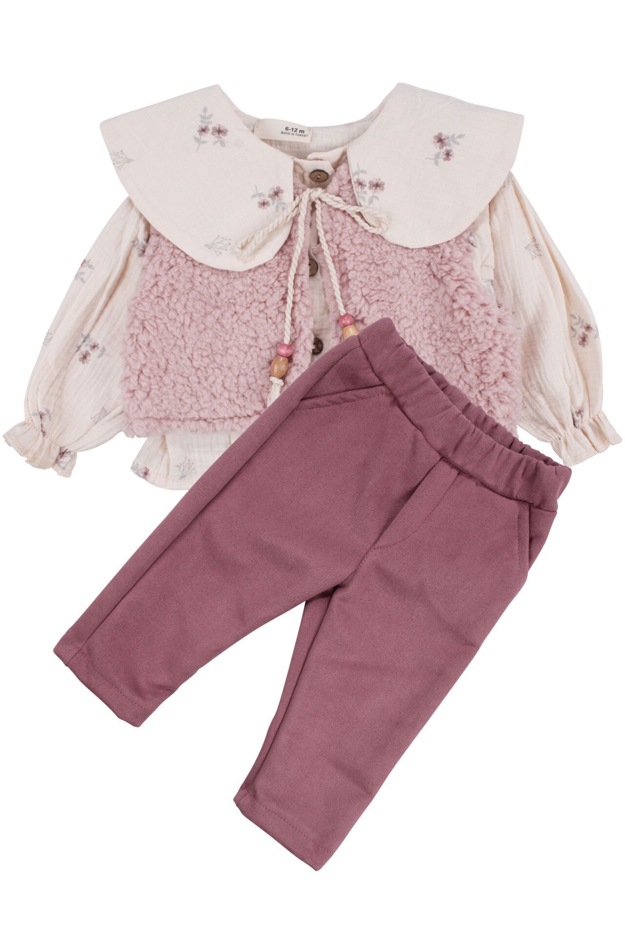Kız Bebek Ekru Pembe Peluş Yelekli Müslin Gömlekli 3'lü Lüks Takım