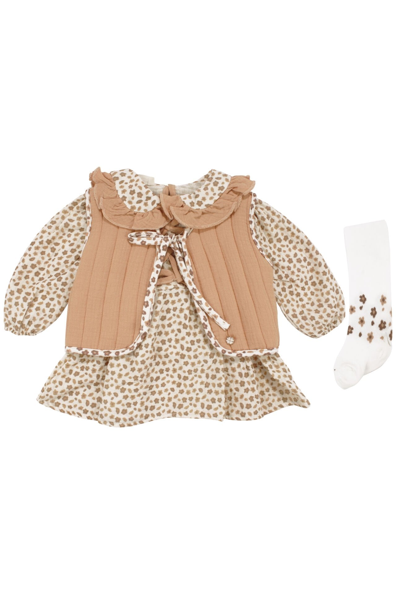 Kız Bebek Ekru Turuncu Kapitone Yelekli Çiçek Desenli Yakalı Lüks 3'lü Elbise Takım