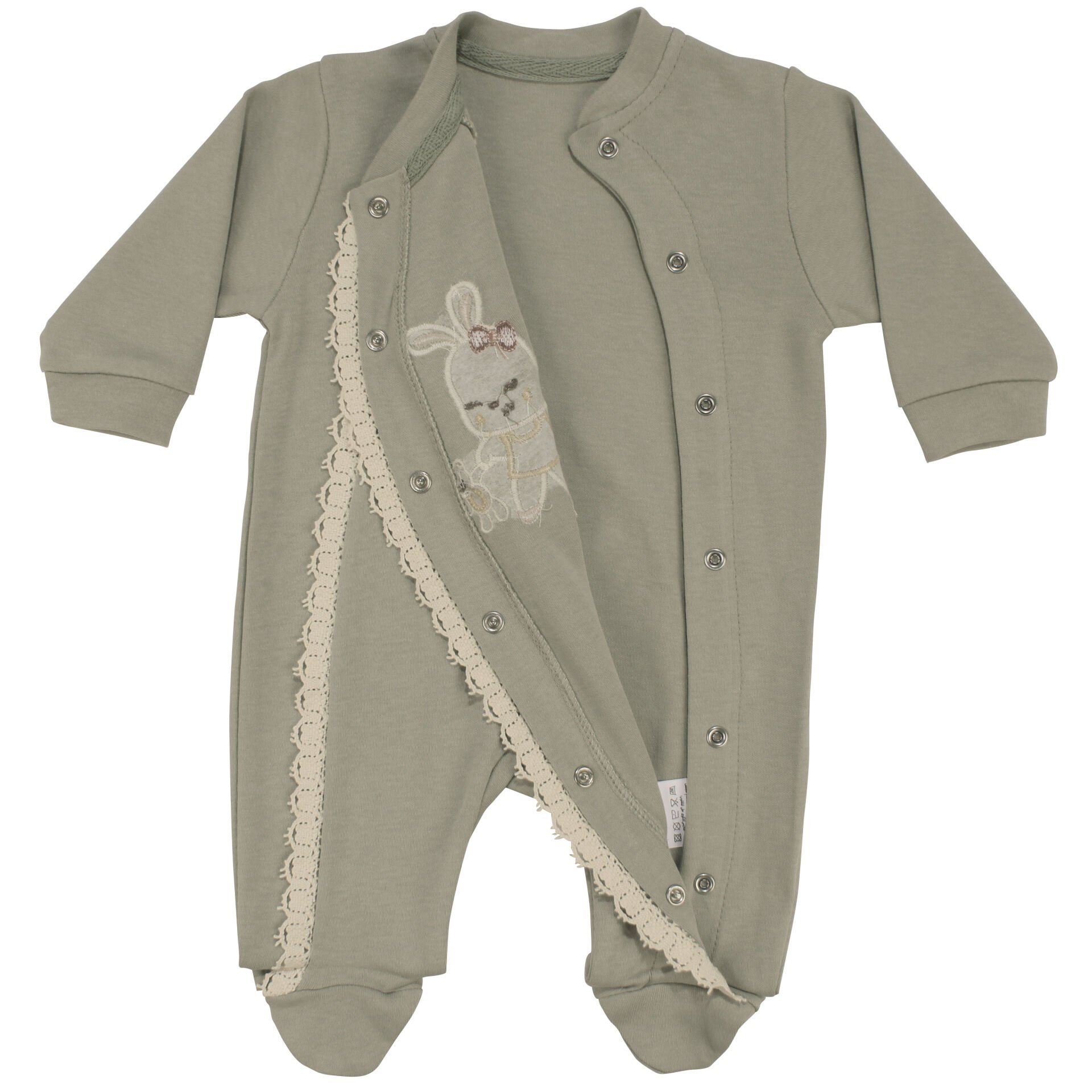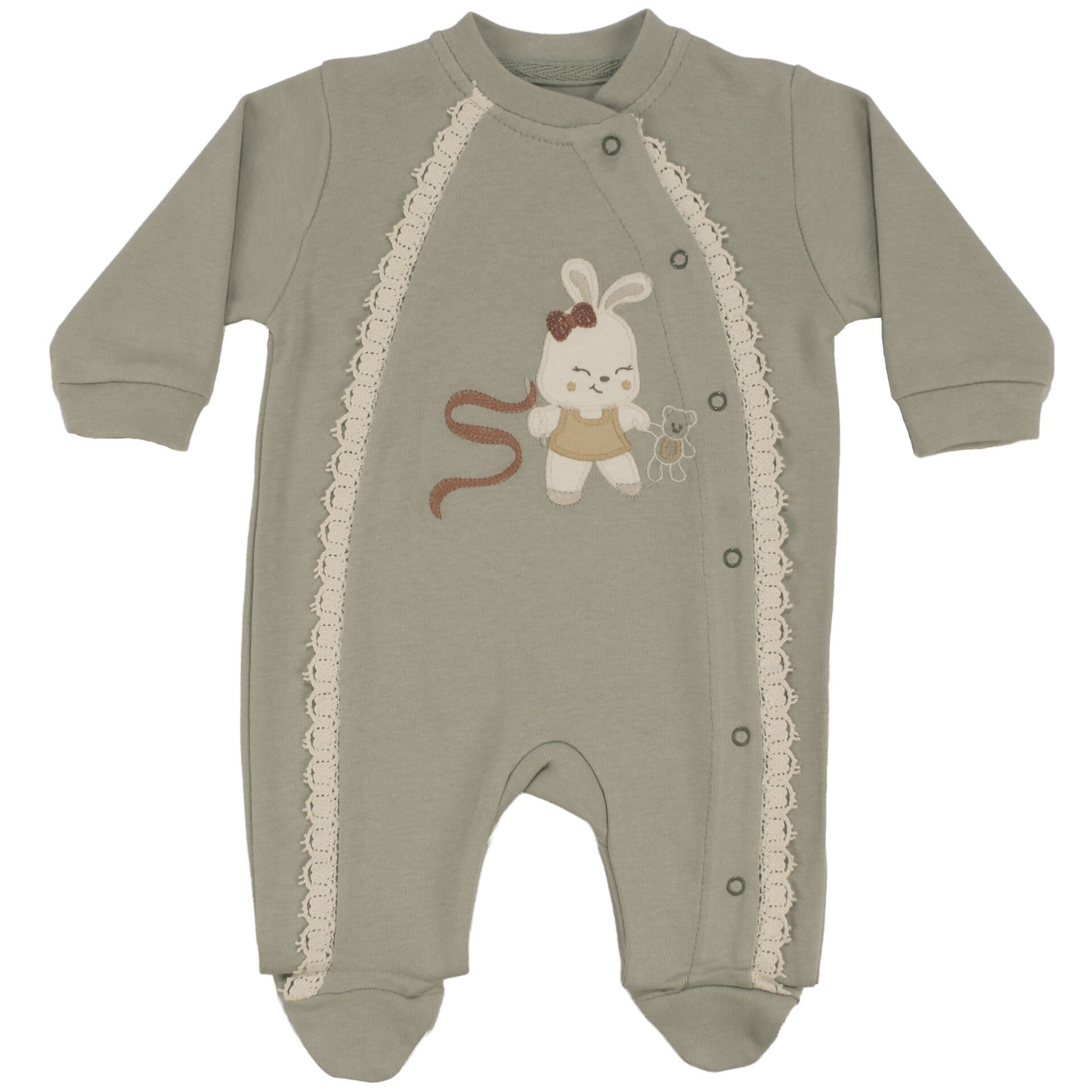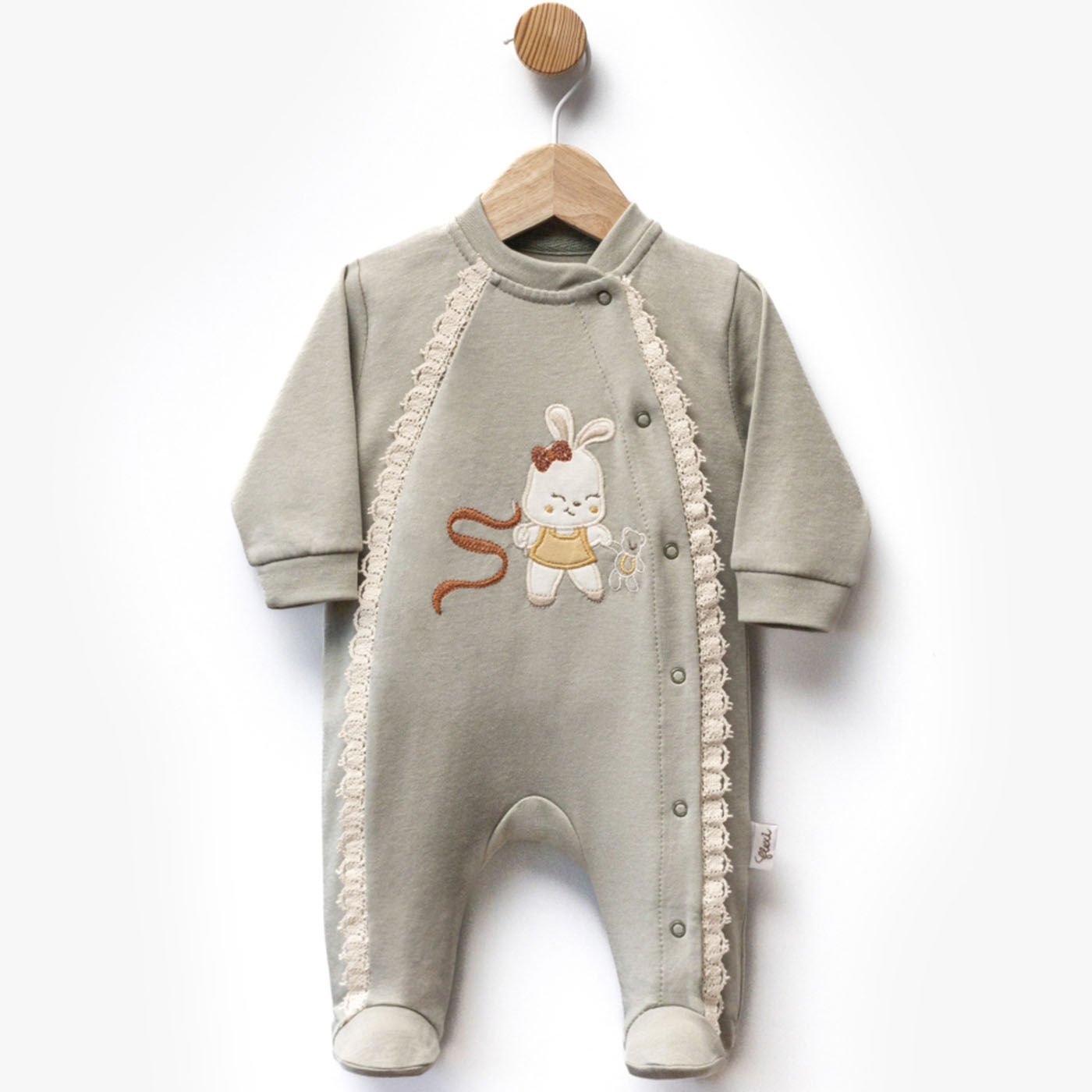 Kız Bebek Haki Yeşil Fistolu Tavşanlı Desenli Çıtçıtlı Patikli Tulum