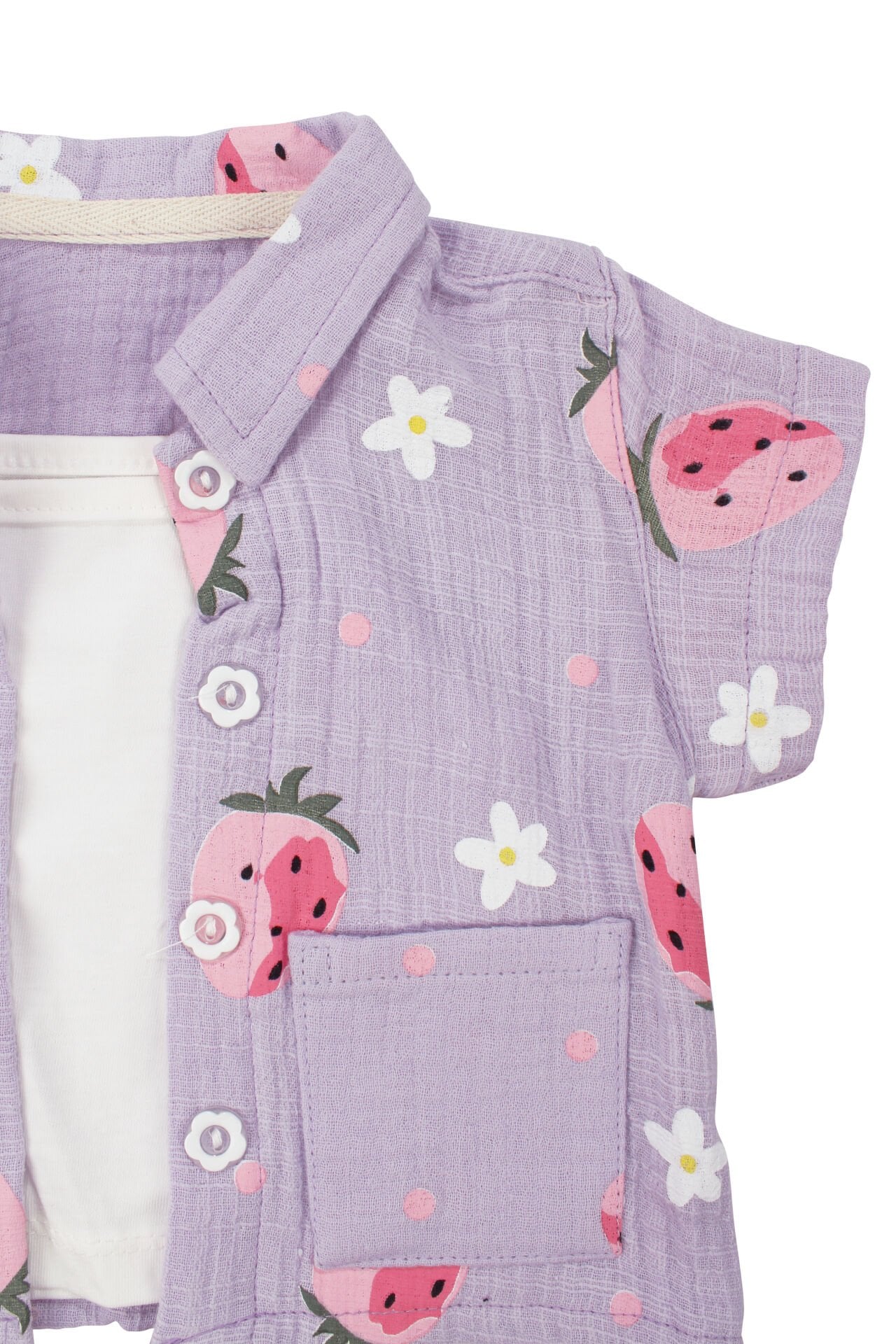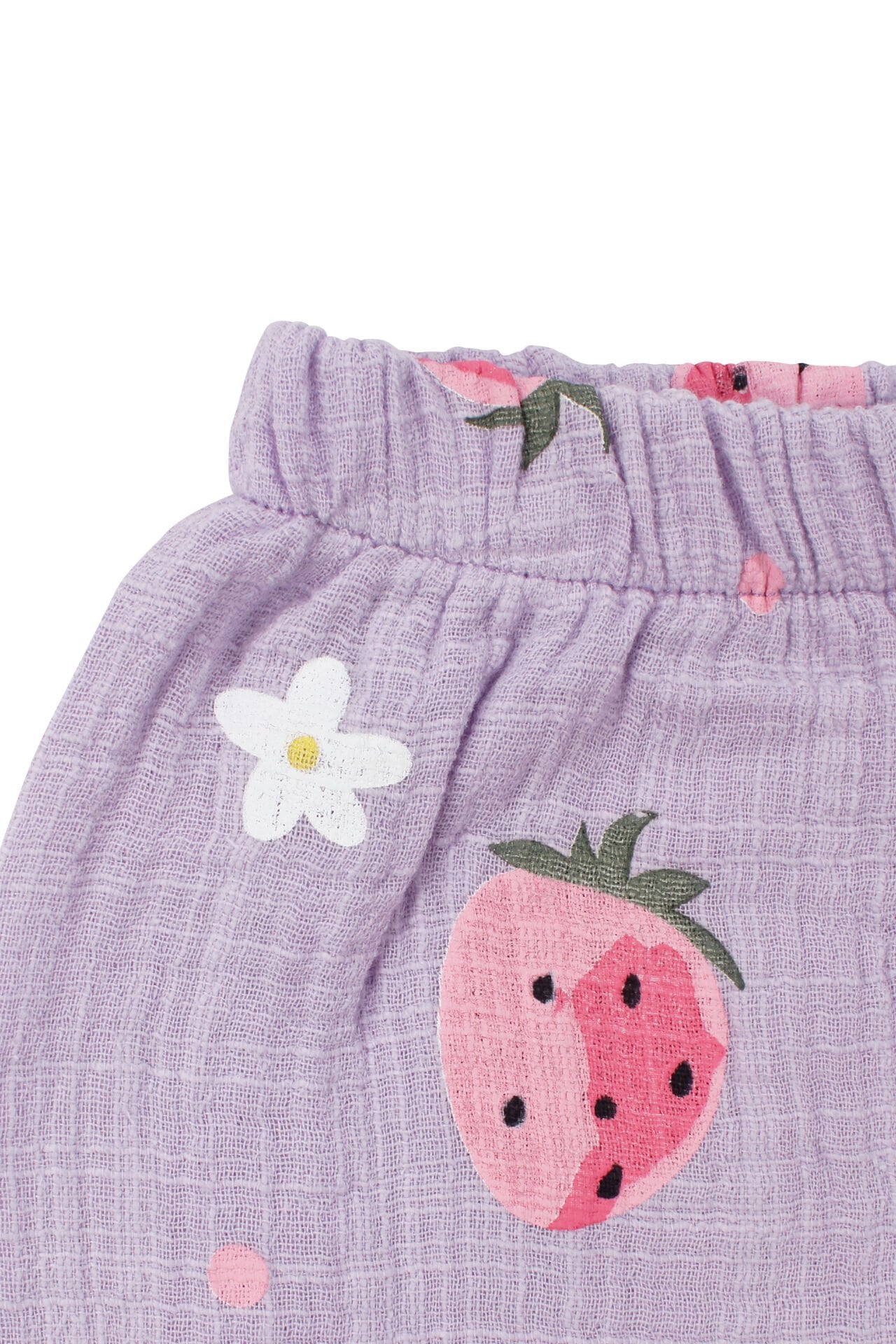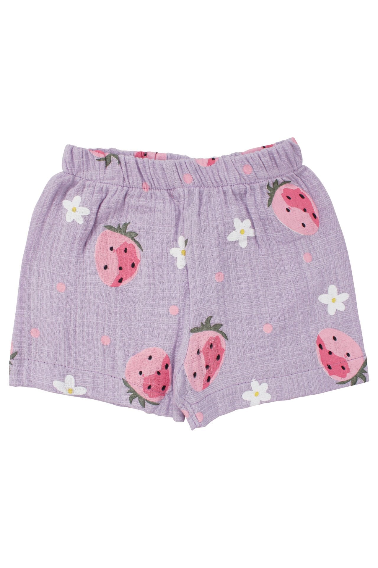 Kız Bebek Lila Pembe Çilek Desenli Müslin Şortlu 3'lü Takım