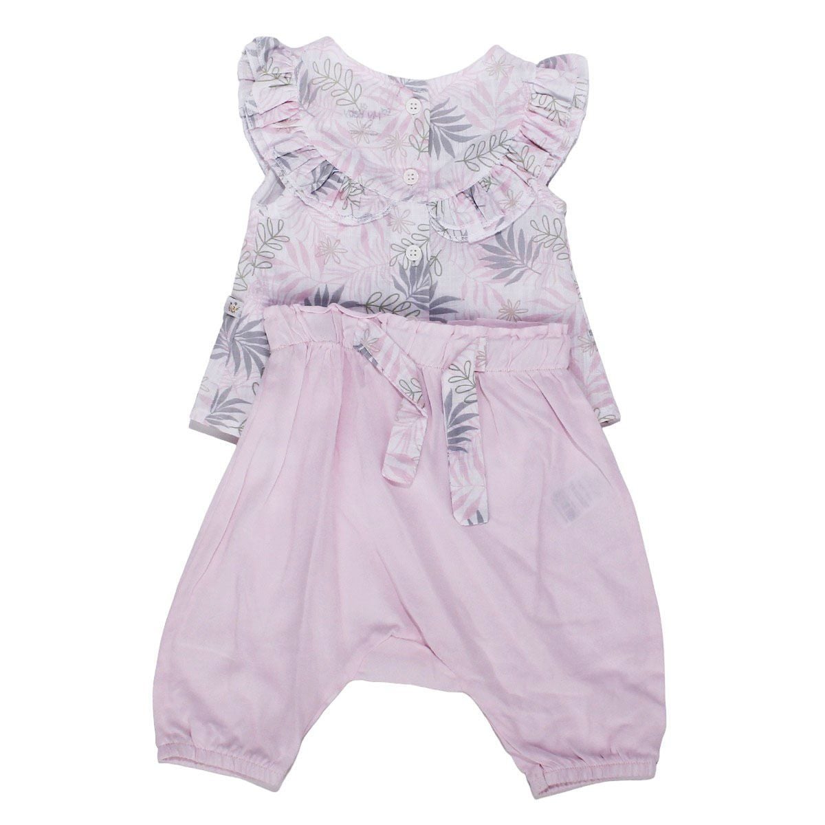 Kız Bebek Pembe Gri Yaprak Desenli Yakası Fırfırlı Paçası Lastikli Pantolonlu 2'li Takım