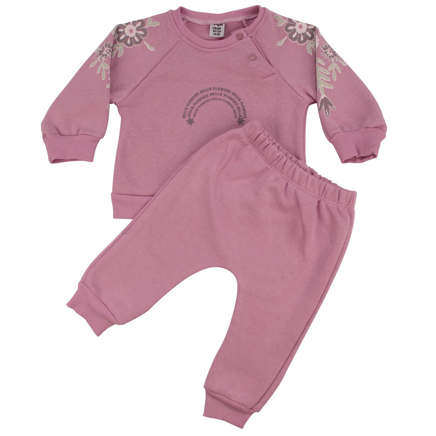 Üst kısmındaki Hello Flowers yazısı ve çiçek baskıları, takıma sevimli ve neşeli bir detay katar. Canlı pembe renk, miniklerin enerjisini yansıtan modern bir görünüm sağlar.