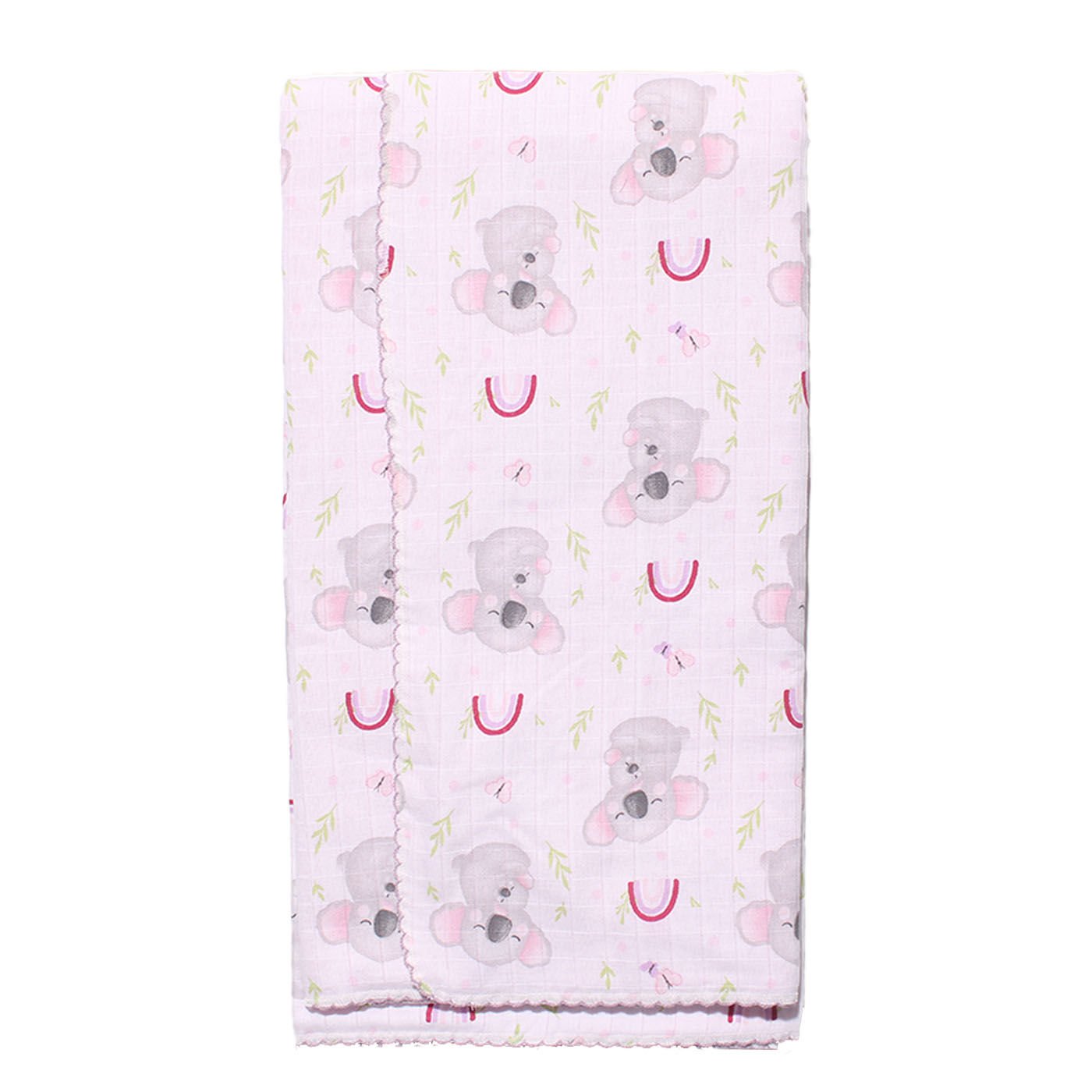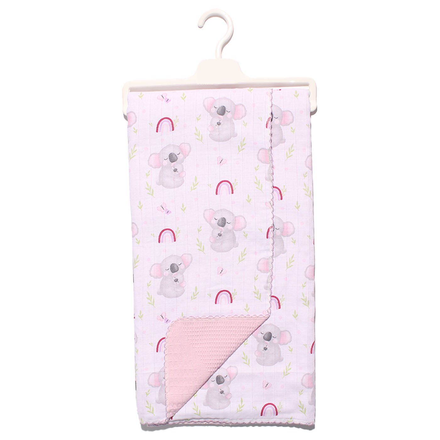 Kız Bebek Pembe Mor Biyeli Koalalı Gökkuşağı Desenli Pikeli Müslin Battaniye 80x90