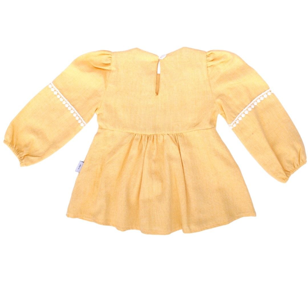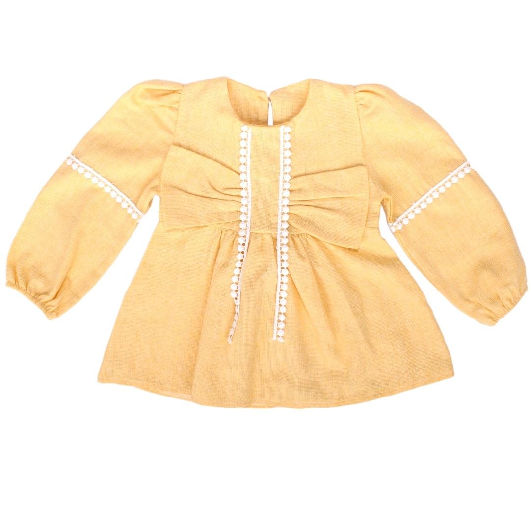 Kız Bebek Sarı Fiyonklu Dantelli Keten Elbise