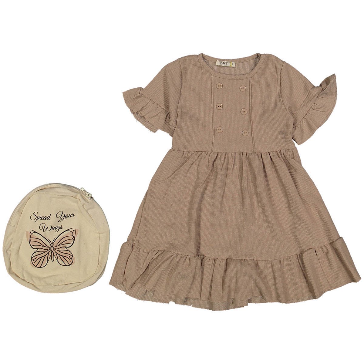 Kız Çocuk Bej Düğmeli Fırfırlı Kelebek Baskılı Çantalı Elbise