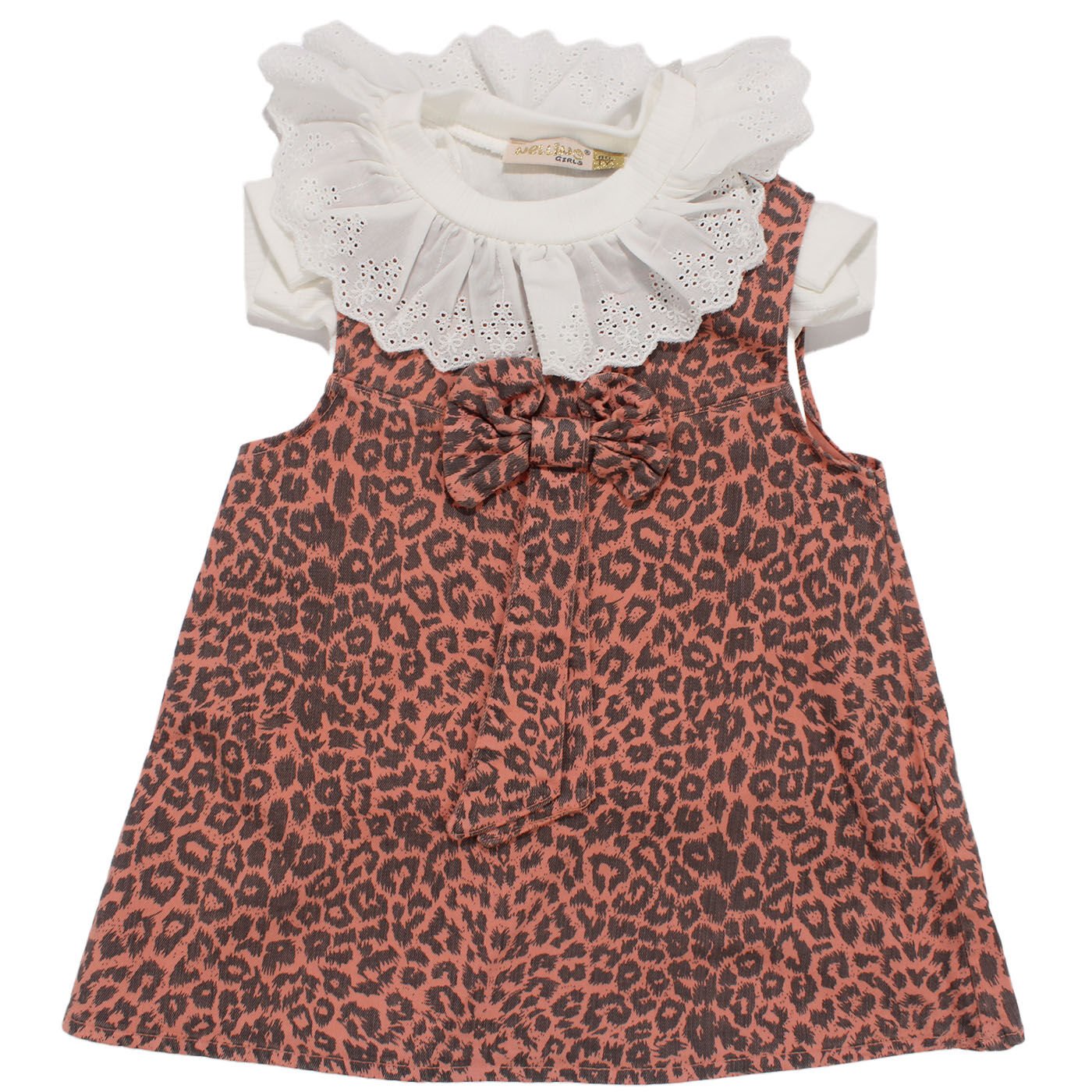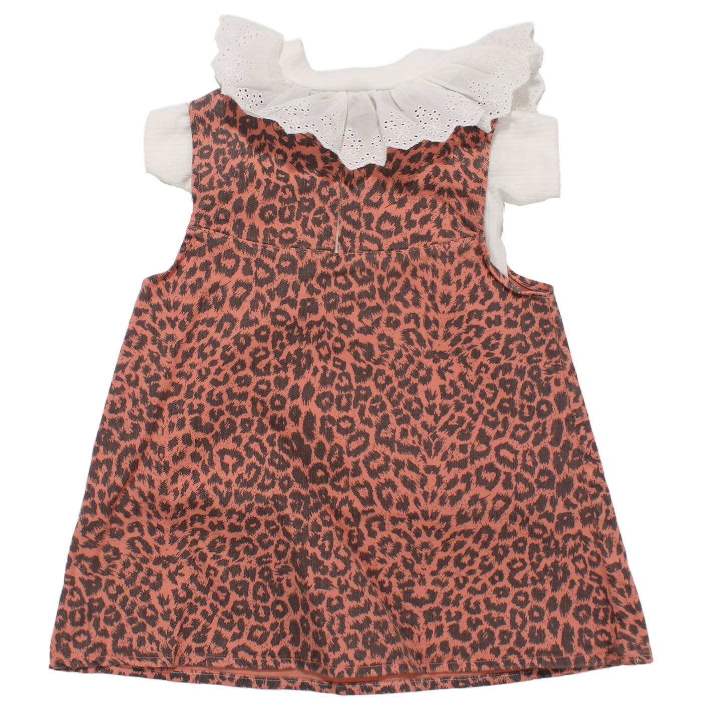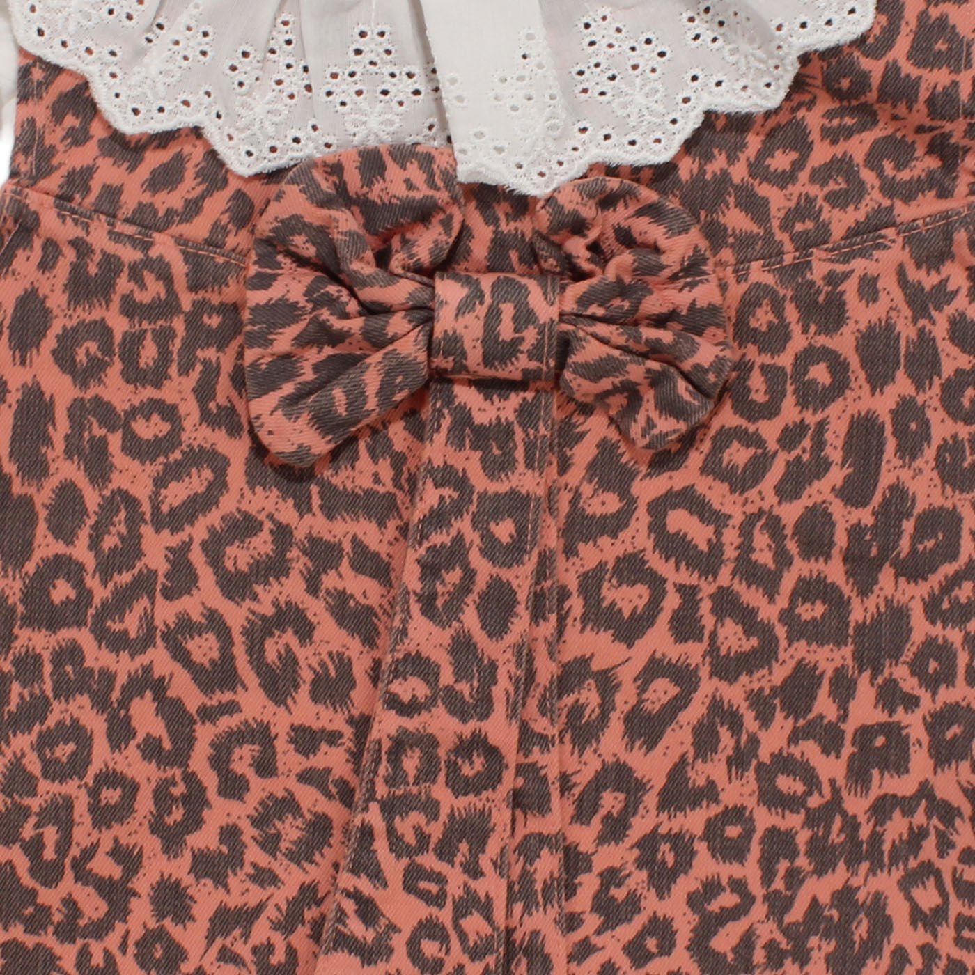 Kız Çocuk Beyaz Kiremit Leopar Desenli Tek Fiyonklu Kot Elbise