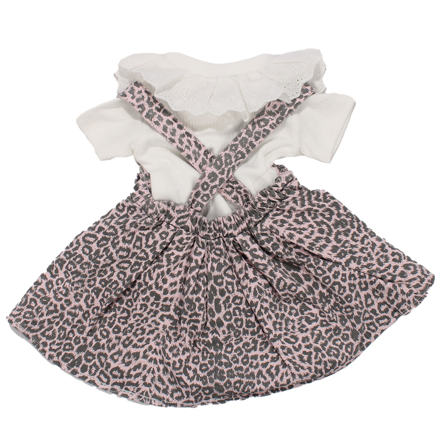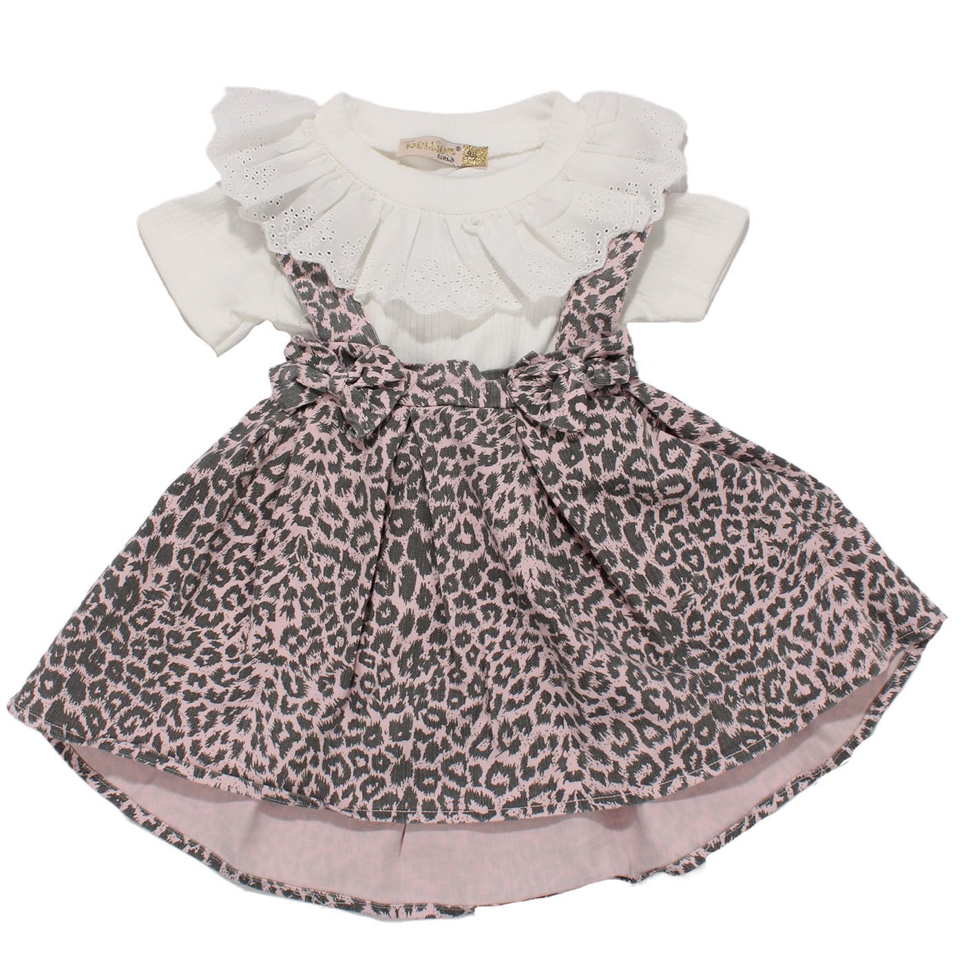 Kız Çocuk Beyaz Pembe Leopar Desenli Fiyonklu Kot Salopet Jile Elbise